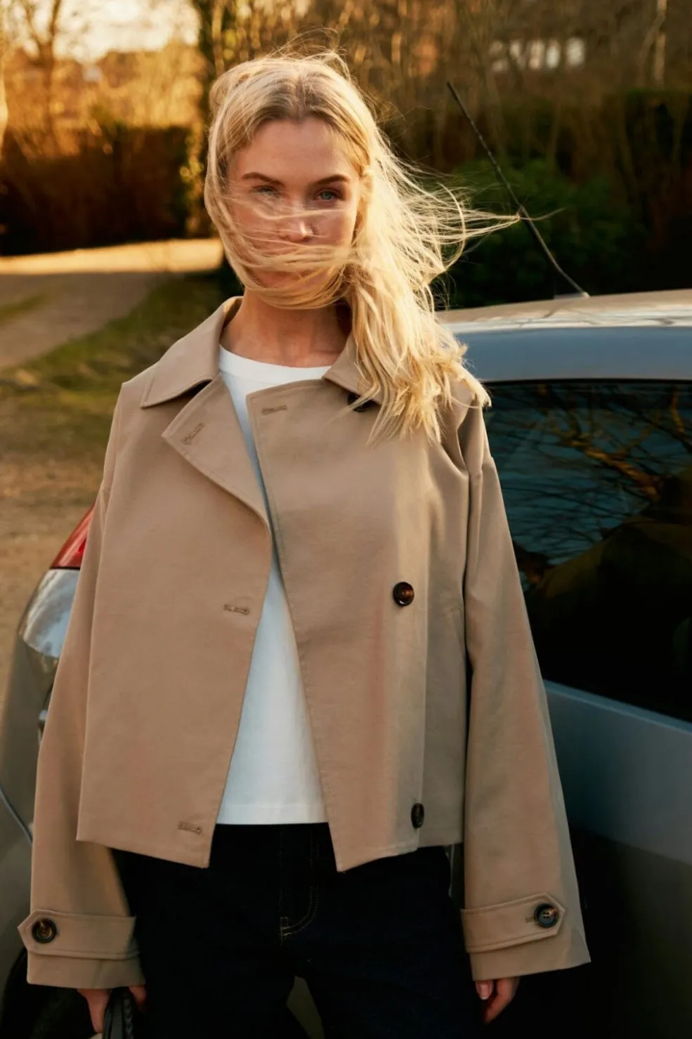 Sandfarvet jakke fra Neo Noir med dobbeltbrystet design. Den brede krave og knapperne foran giver jakken et klassisk udtryk, mens ærmedetaljerne tilføjer et personligt præg.