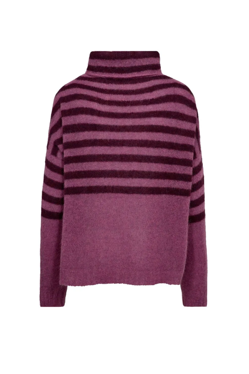 Stribet sweater fra Gossia i to nuancer af blommefarve. Den har en høj hals og vandrette striber på overkroppen.