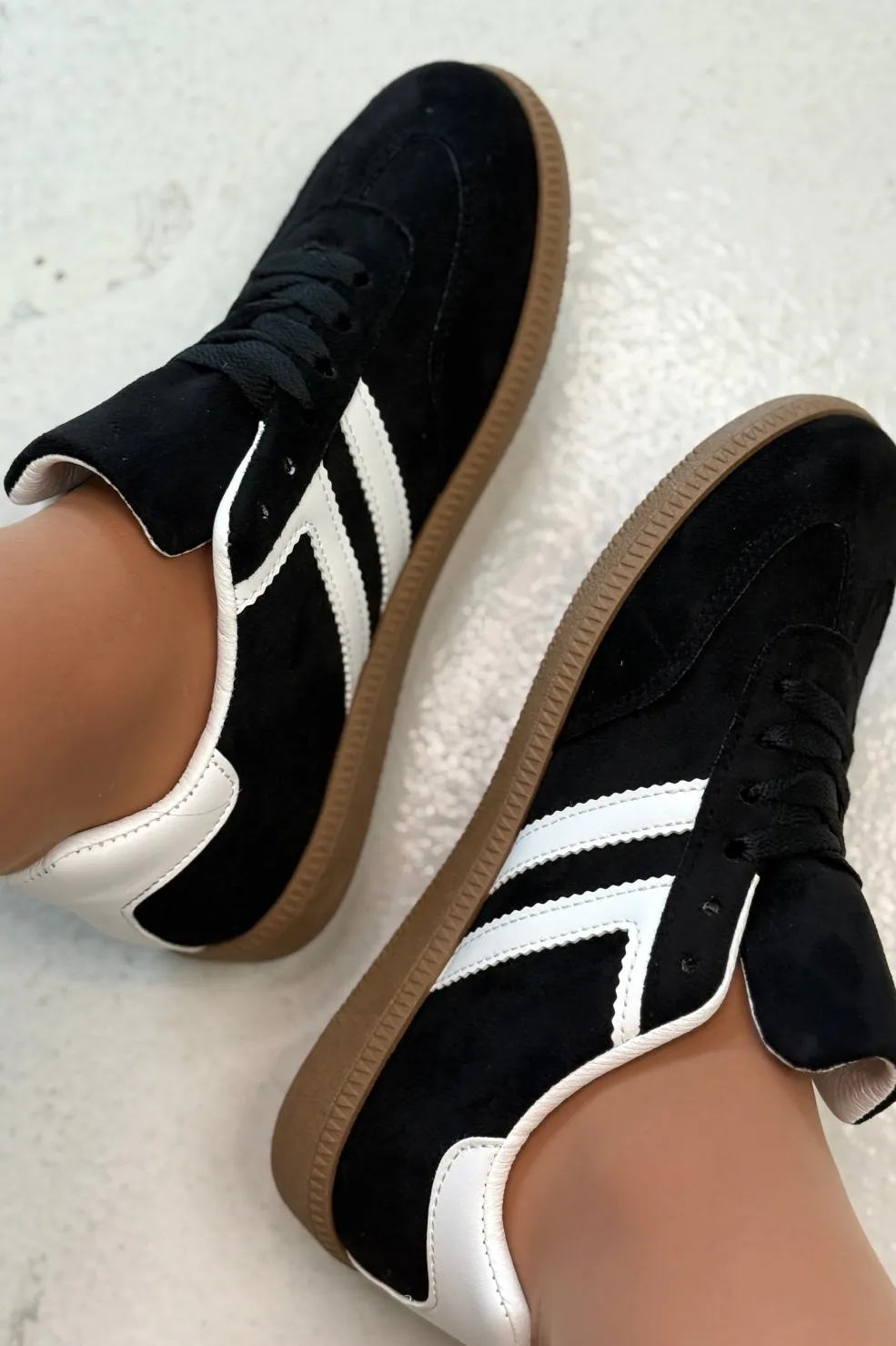 Sort sneaker fra Bloom med hvide striber på siden og brun sål. Skoen har sorte snørebånd og en rund tå.