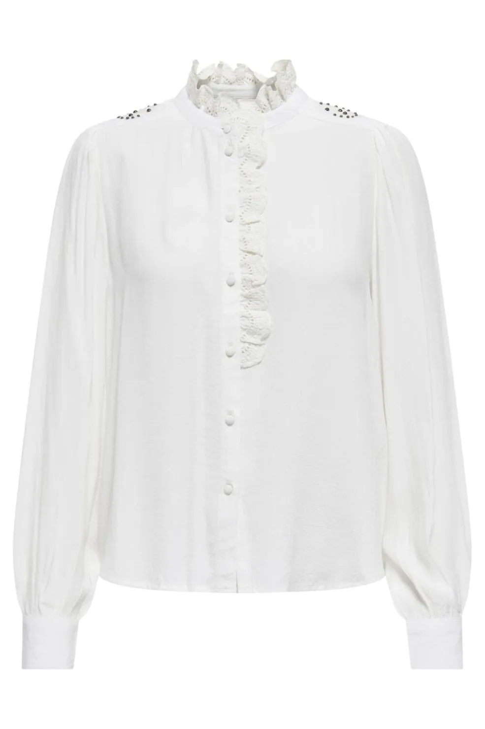 Hvid skjorte fra JDY med flæser og blondedetaljer. Skjorten har lange ærmer med volumen og en klassisk skjortekrave med rynket kant. Knapperne foran gør den nem at tage på.