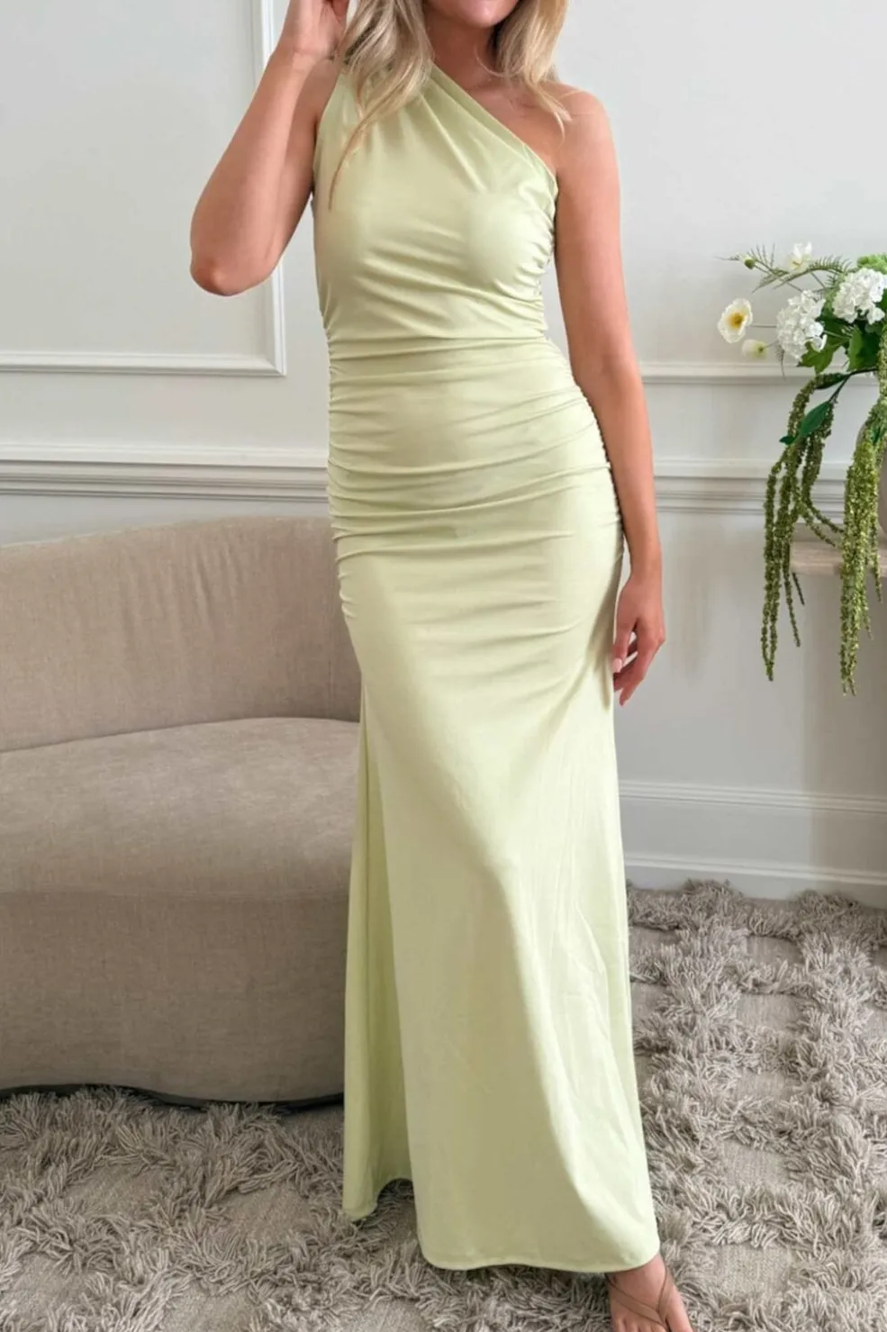 Lysegrøn maxikjole fra BYIC med one-shoulder design. Kjolen har en A-formet nederdel og rynkning langs siden, der giver et flot fald fra top til bund.