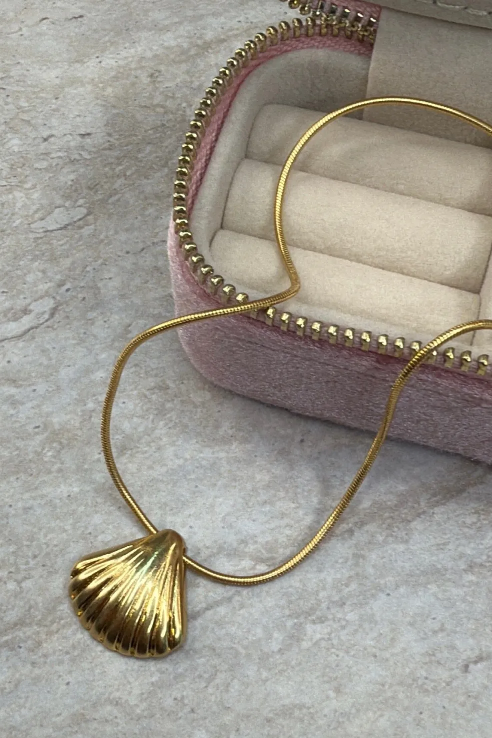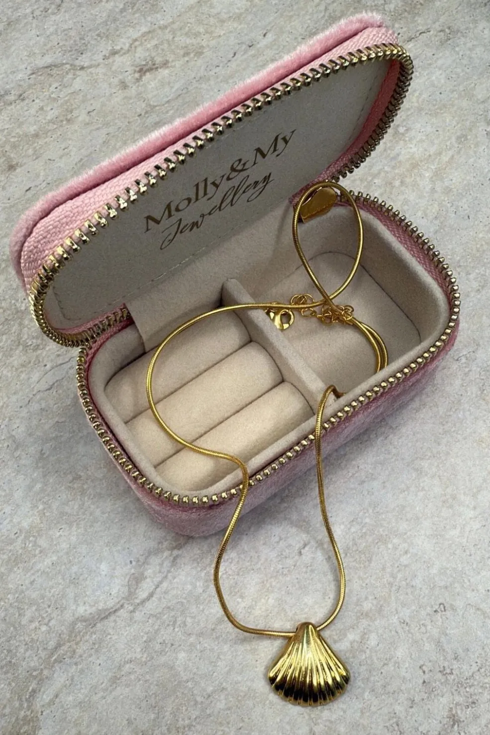 Halskæde fra Molly&My Jewellery med et muslingeformet vedhæng i forgyldt rustfrit stål. Kæden har en glat struktur og leveres i en lyserød smykkeæske.