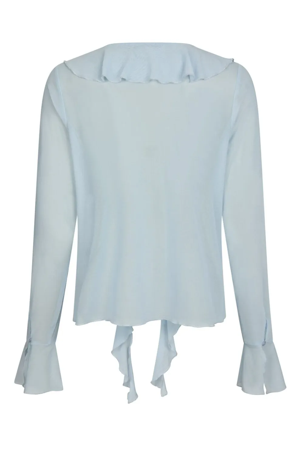 Lyseblå meshbluse fra Neo Noir med V-udskæring og flæser. Blusen har løs pasform og bindedetalje foran. De lange ærmer afsluttes med flæsedetaljer.