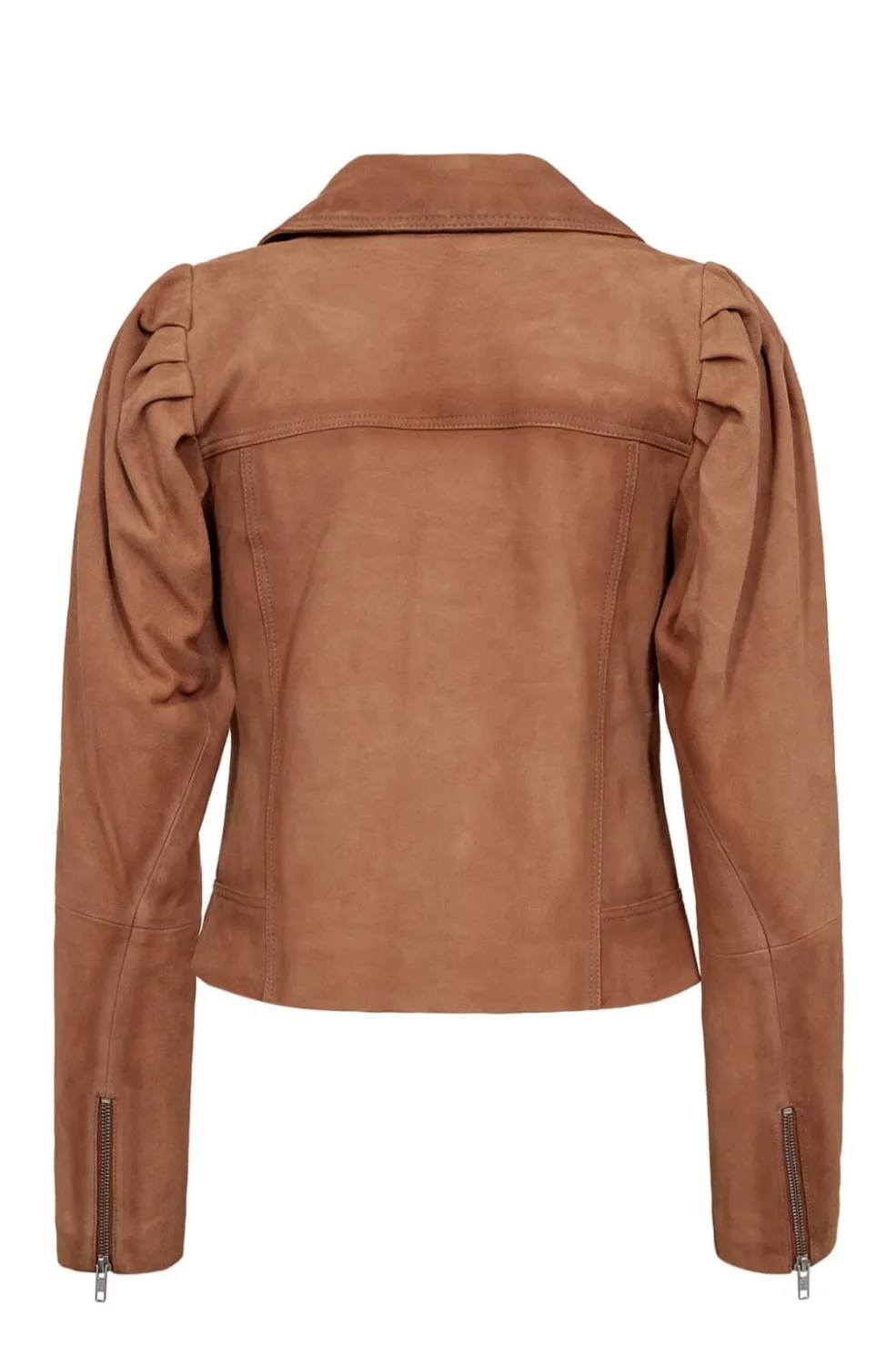 Brun ruskindjakke fra Gossia med asymmetrisk lynlås og skjortekrave. Jakken har dekorative syninger på skuldrene og flere lukkemuligheder.