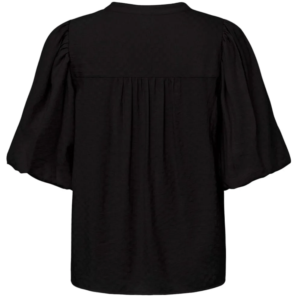 Sort bluse fra Gossia med albuelange pufærmer i jacquardvævet stof. Blusen har en dyb V-udskæring med broderet blondekant og et diskret ternet mønster.