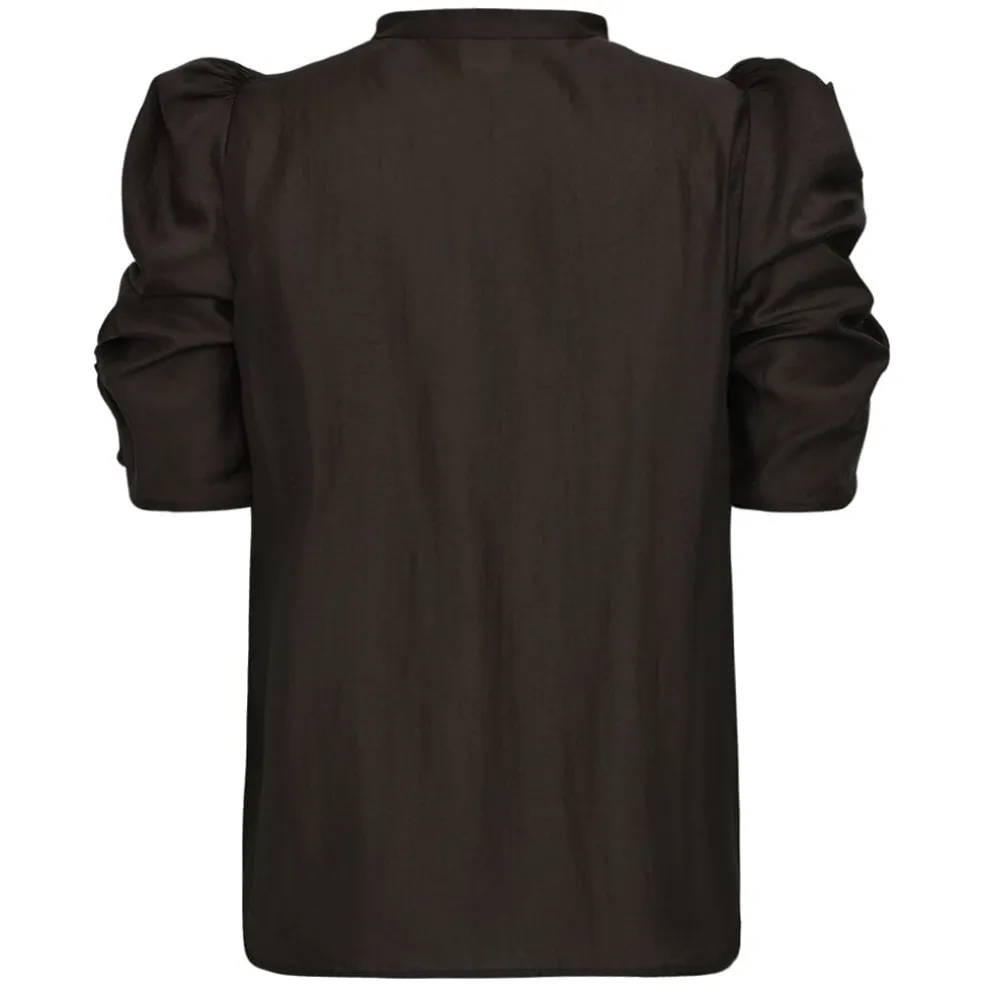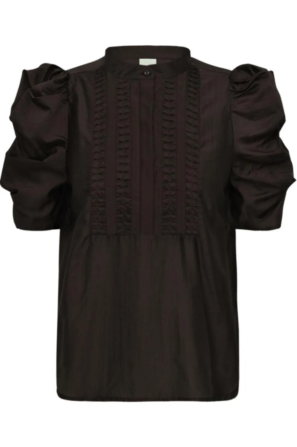 En brun bluse fra Gossia med plisserede detaljer på brystet og pufærmer. Blusen har en skjortekrave og kan bruges til både formelle og afslappede lejligheder.