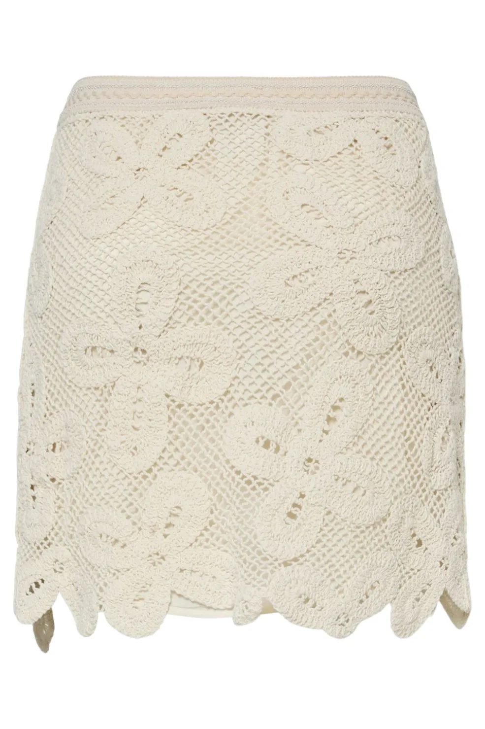 Hæklet nederdel fra Y. A.S i en lys beige nuance. Nederdelen har et gennemgående blomstermønster i hæklet design og en bølget kant forneden.