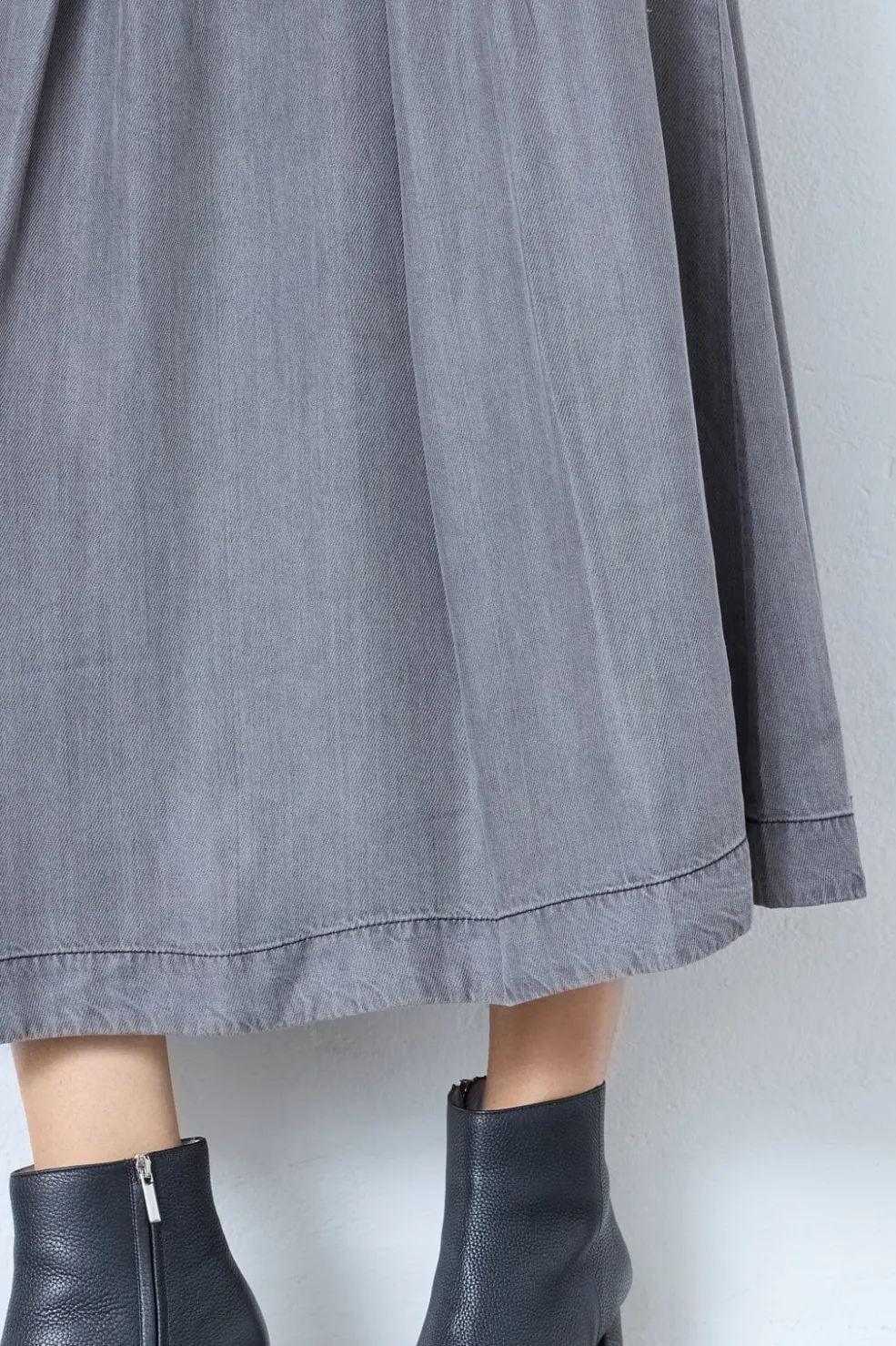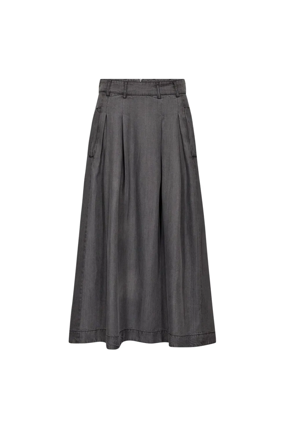 Plisseret nederdel fra Co´Couture i mellemgrå. Nederdelen er lavet af 100 % Lyocell og har en høj talje med bæltestropper. Læggene foran og bagpå giver volumen.