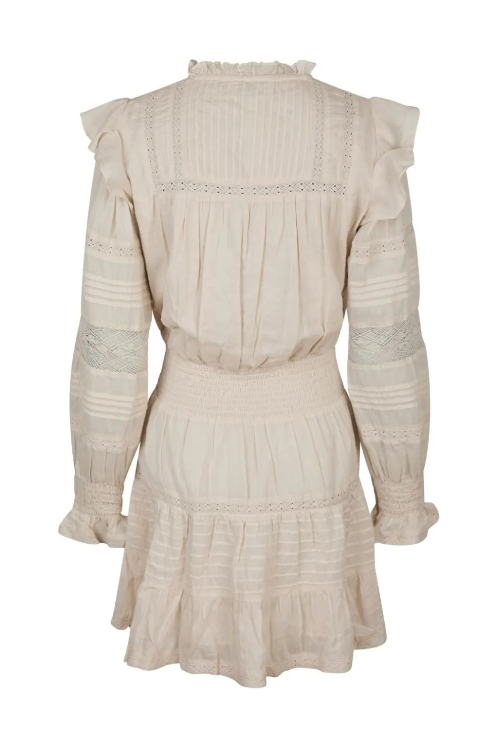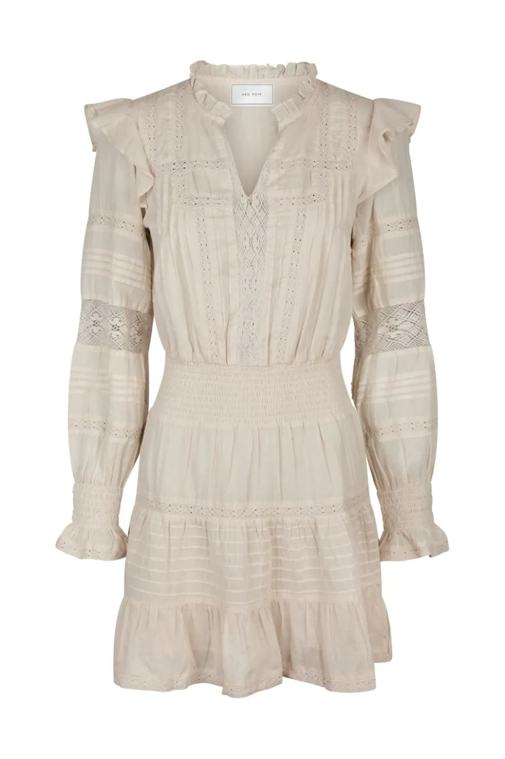 Voilekjole fra Neo Noir i ivory. Kjolen har rynket krave og lange ærmer med elastiske manchetter. Designet består af flere lag stof med fine blondedetaljer og båndpåsætninger.