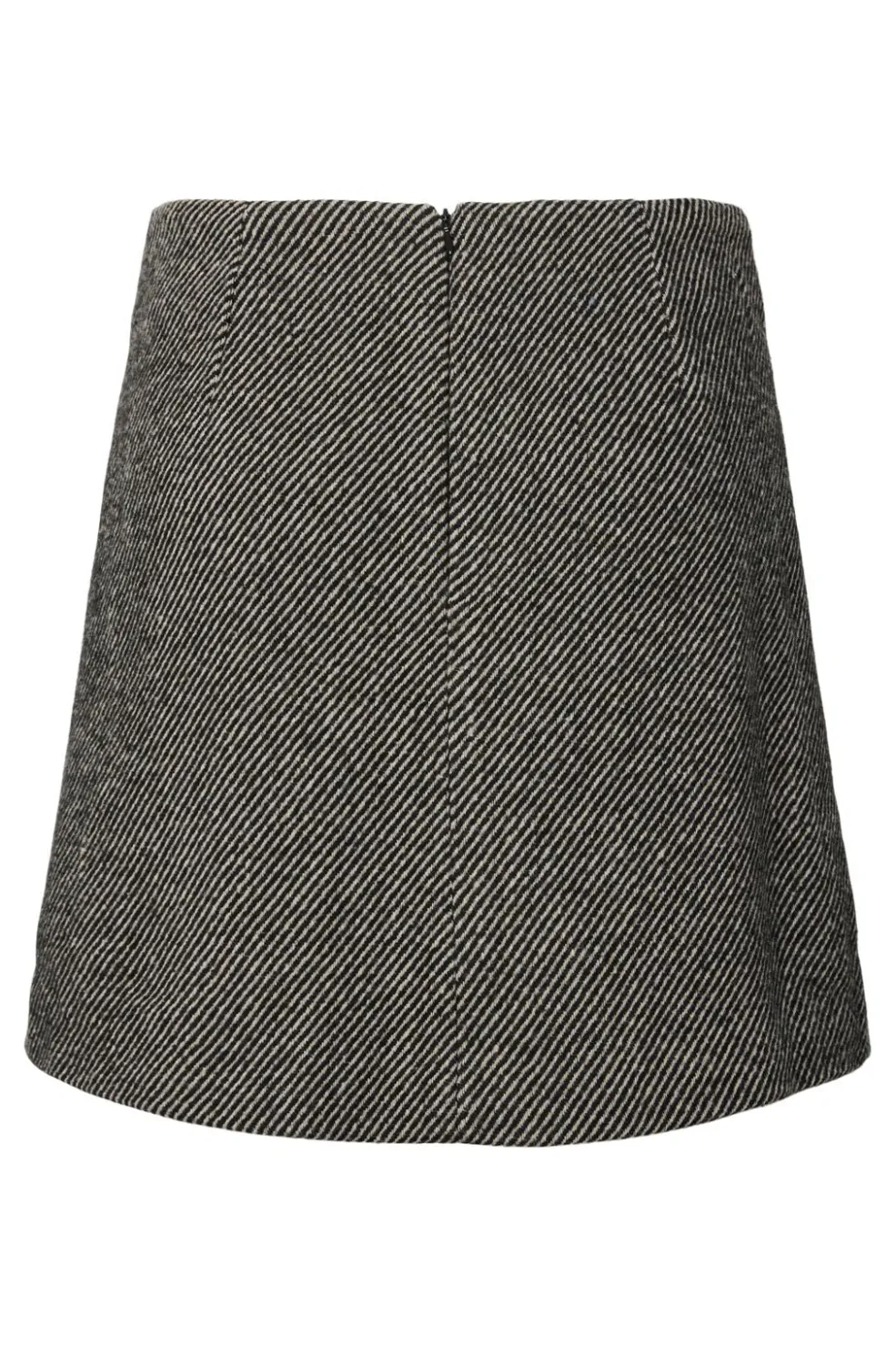 Sort nederdel fra Y. A.S med diagonale striber. Den har høj talje og en flaplomme på forsiden med to knapper på højre side.