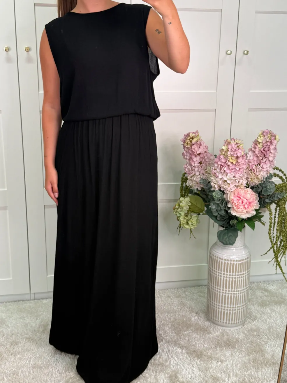 Sort nederdel fra A-bee med en gulvlang længde og en lige, flydende form.