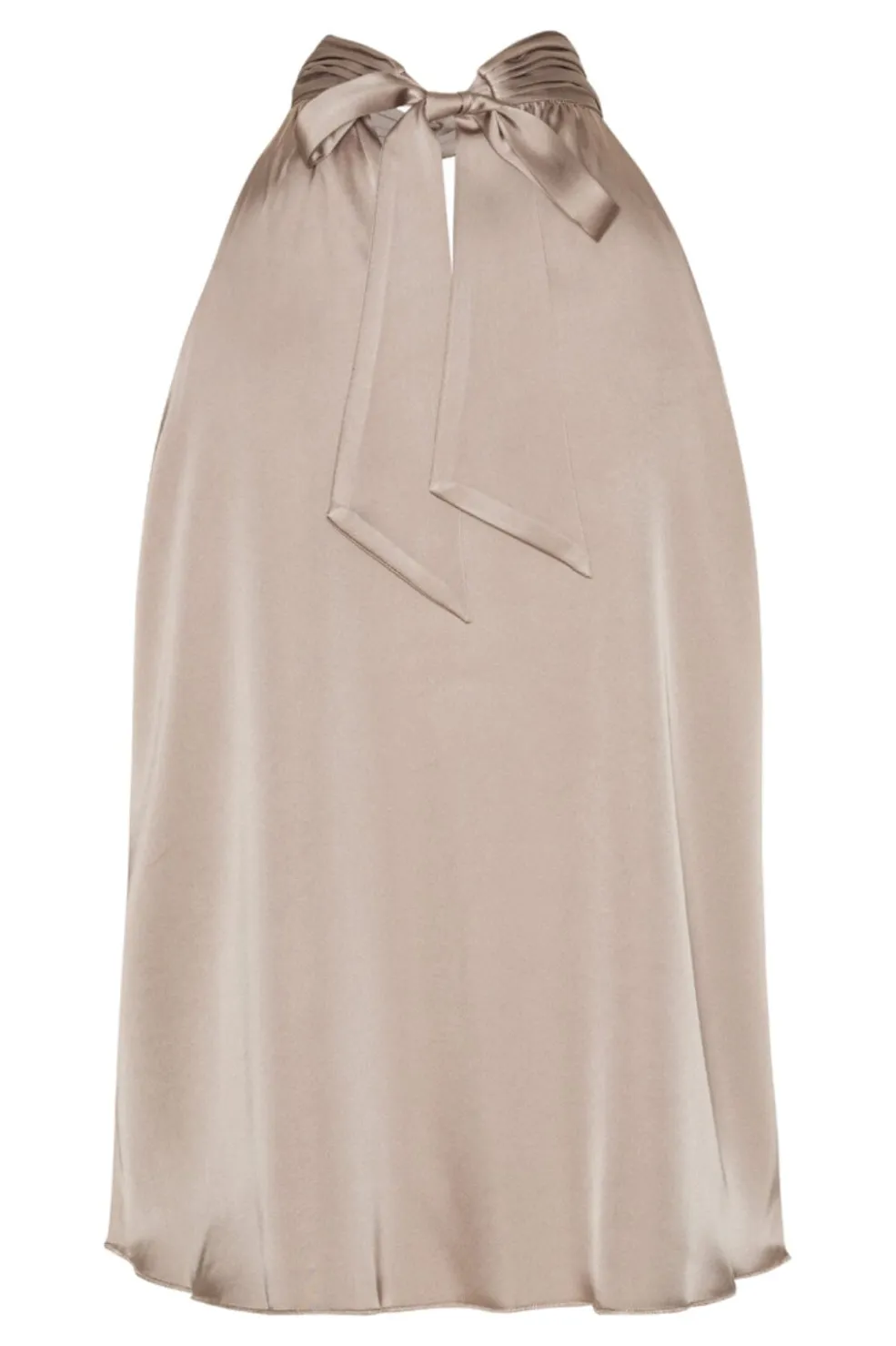 Ærmeløs top fra Karmamia i en varm brun nuance. Toppen har en høj hals med nøglehulskæring og samlet stof ved halsen med bindebånd og flæser.