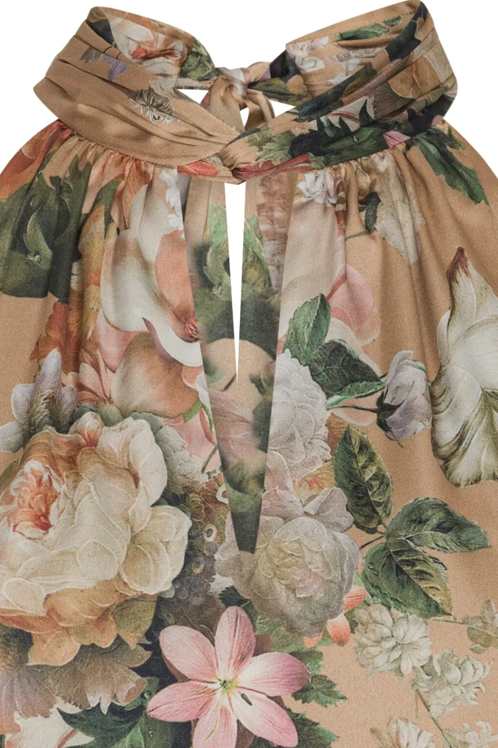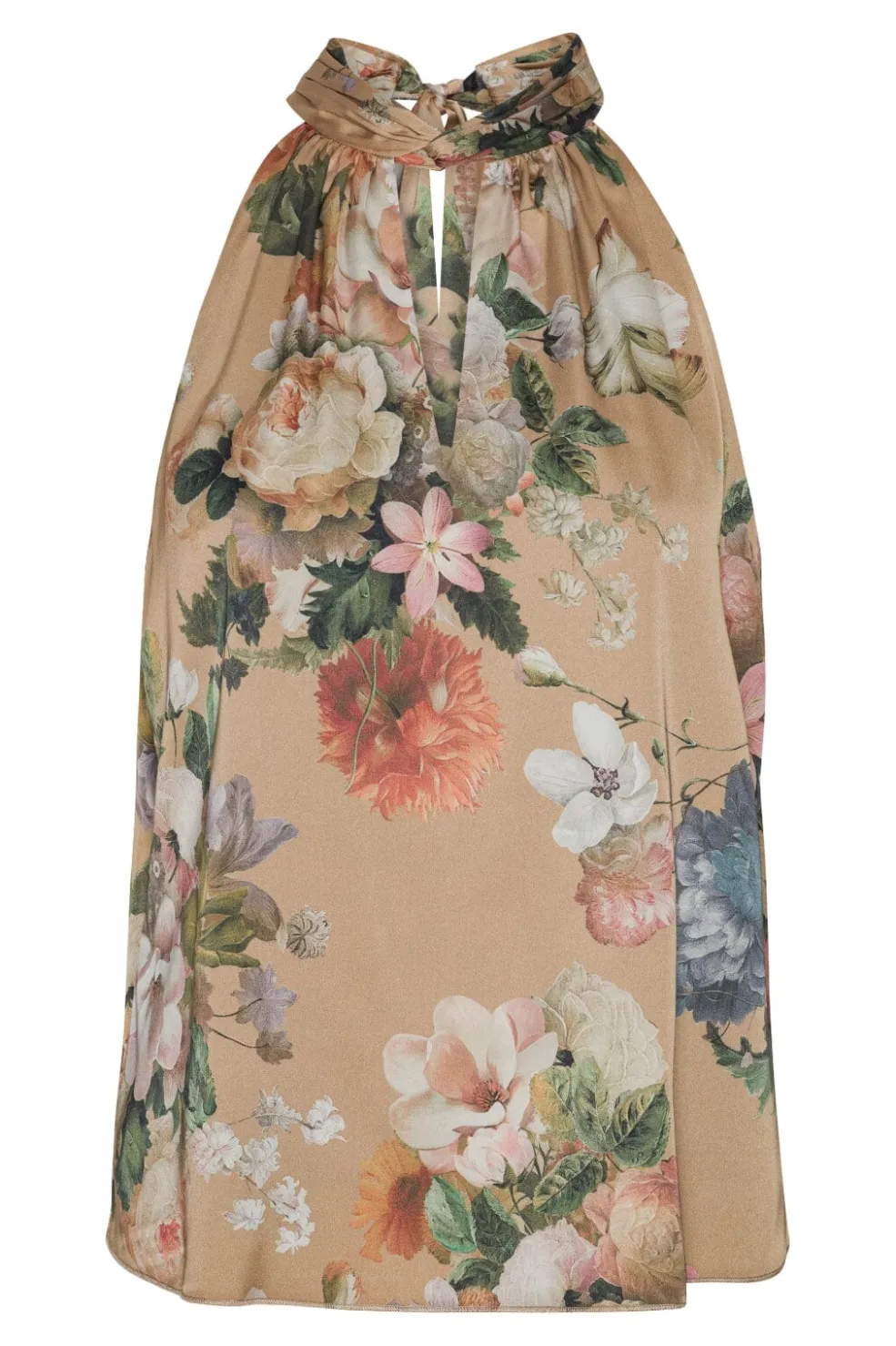 Top med blomsterprint i beige nuancer. Den høje hals har bindebånd bagpå, og det detaljerede blomstermønster viser roser og nelliker i lyse og mørke toner.