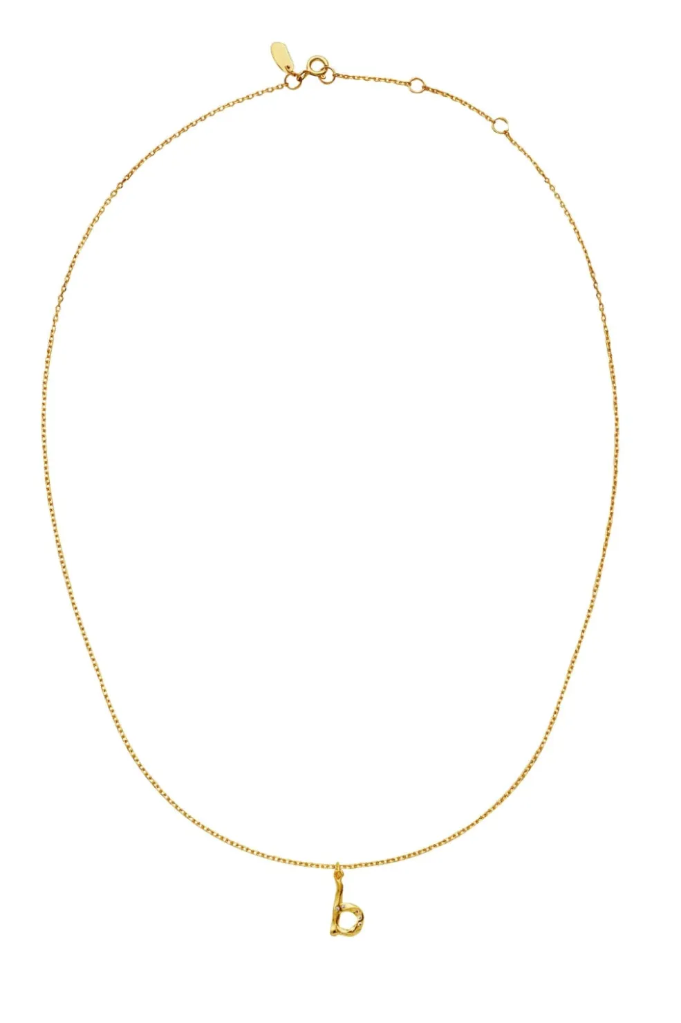 Guldfarvet halskæde fra Maanesten med bogstavet b som vedhæng. Kæden er lavet af genanvendt sterlingsølv med en 18 karat guldbelægning, der giver et blankt udtryk.