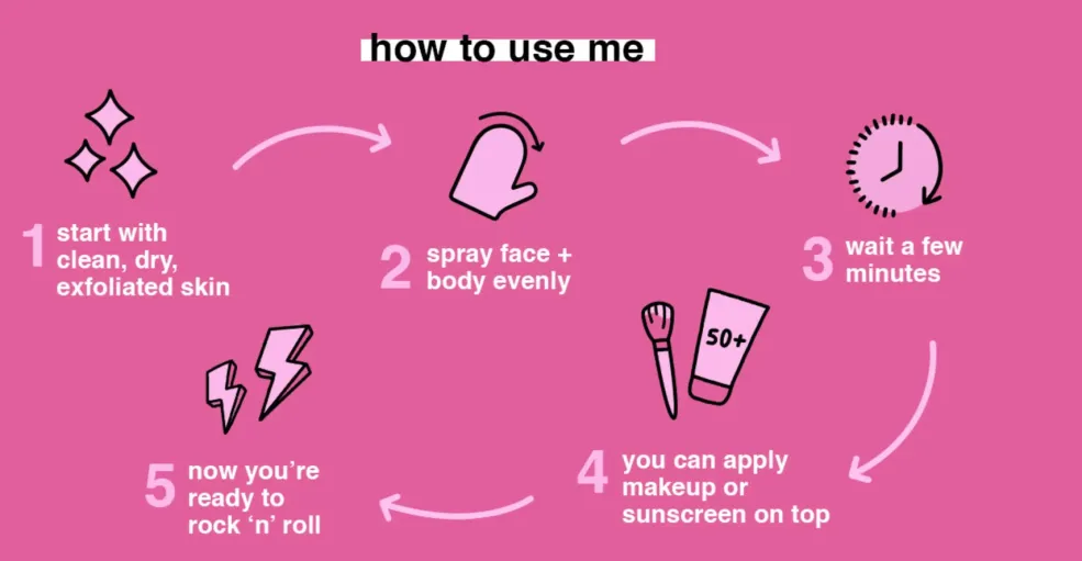 Selvbruner mist til ansigt og krop med naturlig DHA fra sukkerrør. Giver en gradvis og jævn glød, der udvikler sig over et par timer.