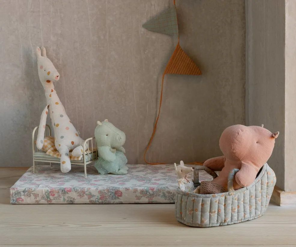 En stor babylift fra Maileg i lyseblå med blomstermønster. Det quiltede design har en blød polstring og kommer med en matchende pude samt et strikket tæppe.