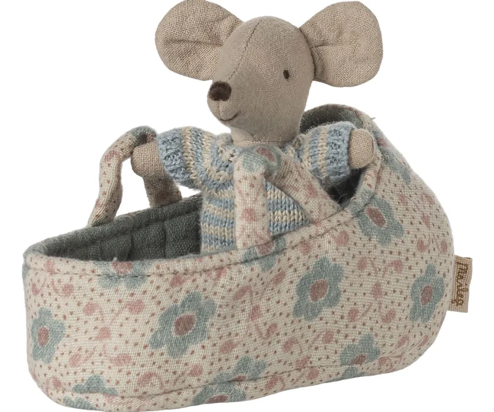 En babymus i babylift fra Maileg. Musen er iført en stribet strikdragt i lyseblå og beige, og liften har et blomstret mønster med håndtag.