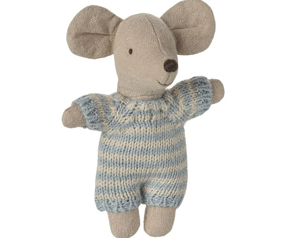 Musebabyen er klædt i en blød, stribet strikdragt i lyseblå og beige. Bomuldsmaterialet giver en blød følelse, der er egnet til leg.