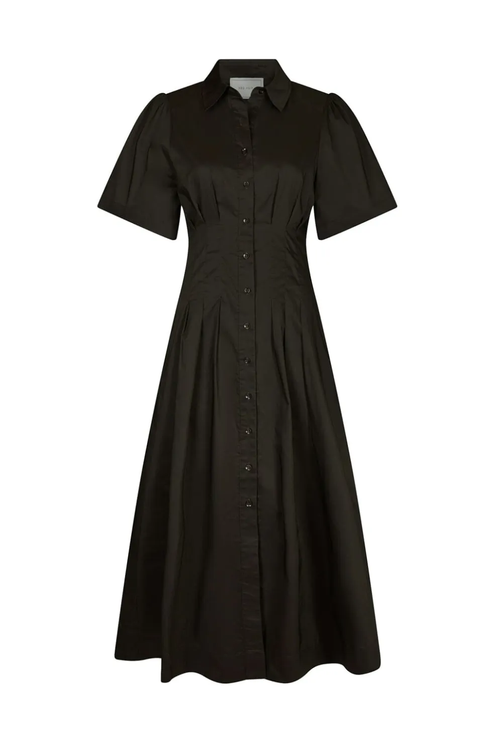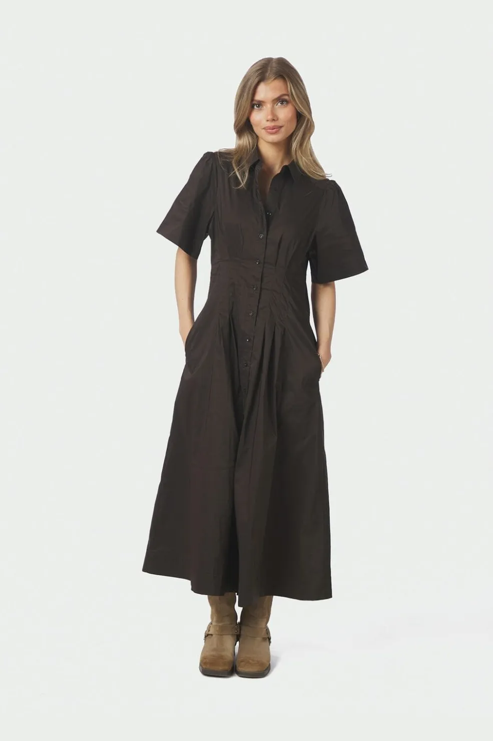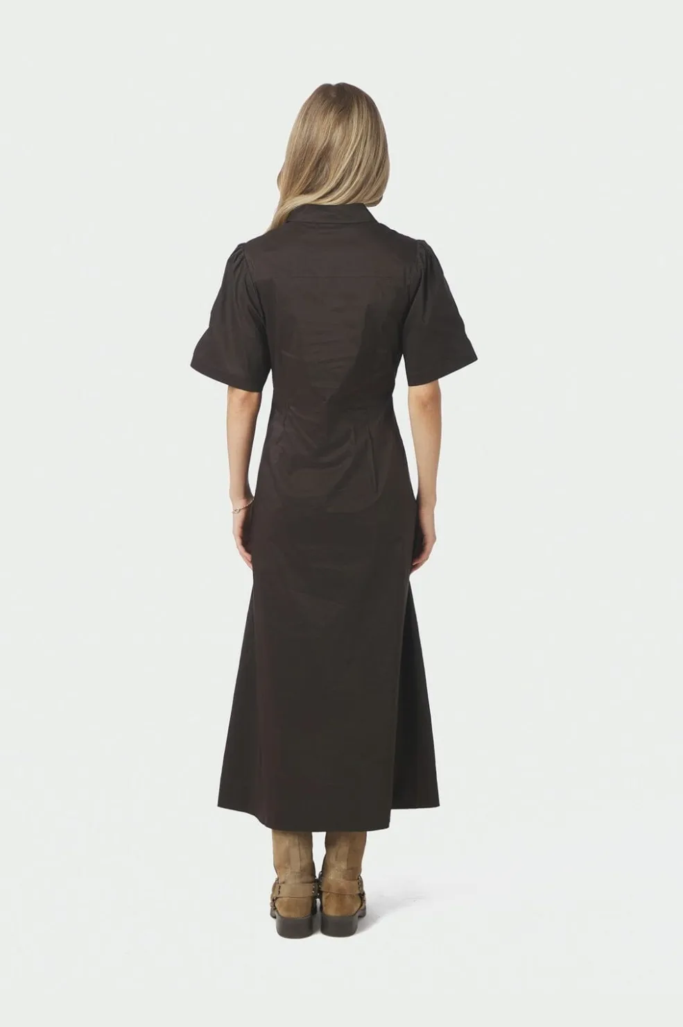 Brun poplin-kjole fra Neo Noir med skjortekrave og korte ærmer. Kjolen er figursyet og går til læggen med knaplukning hele vejen ned.
