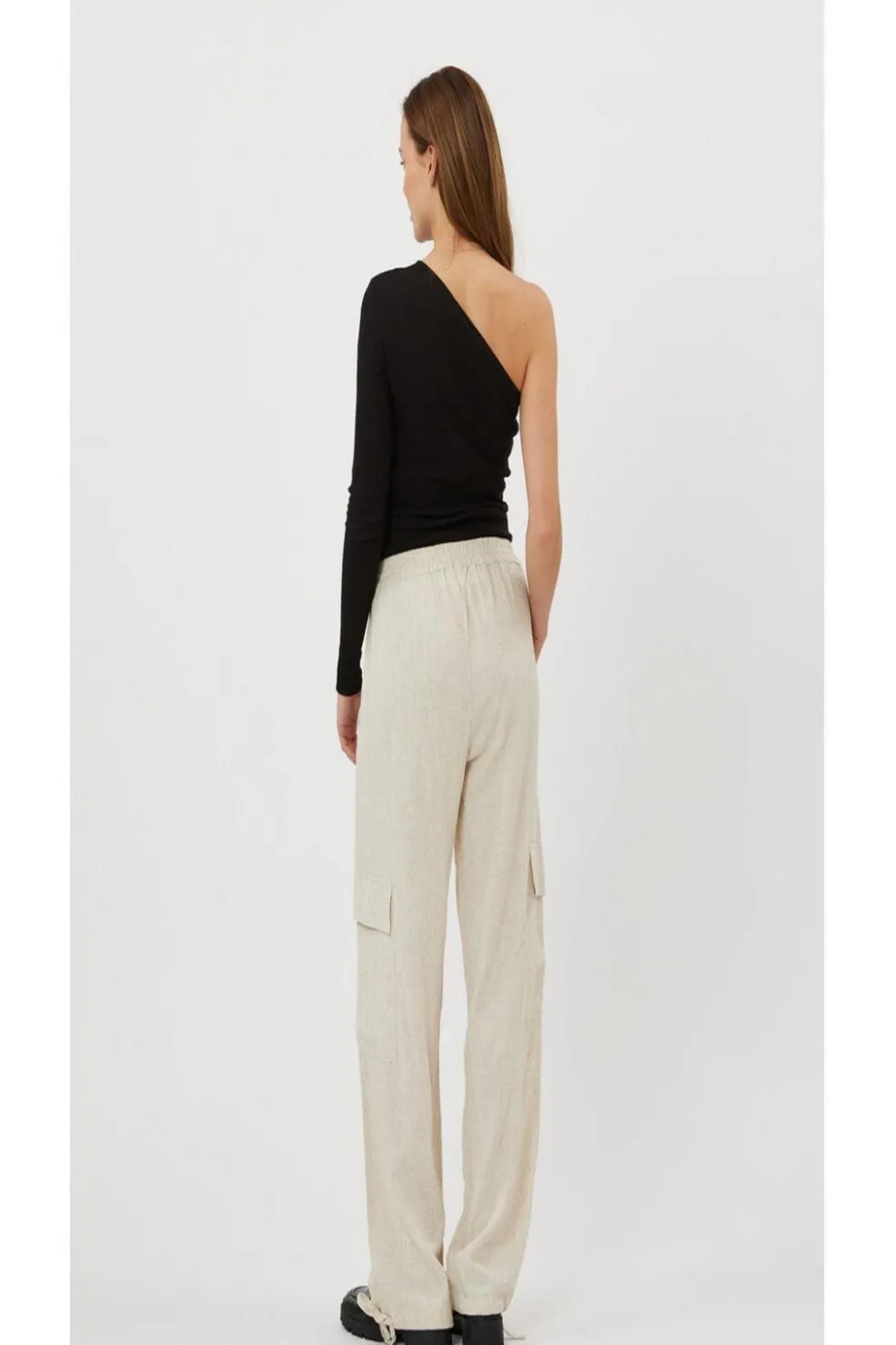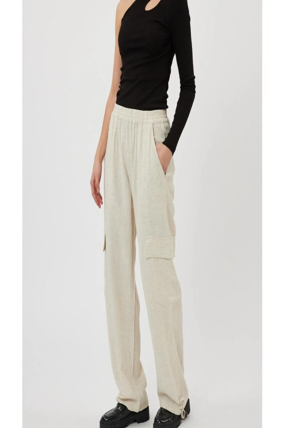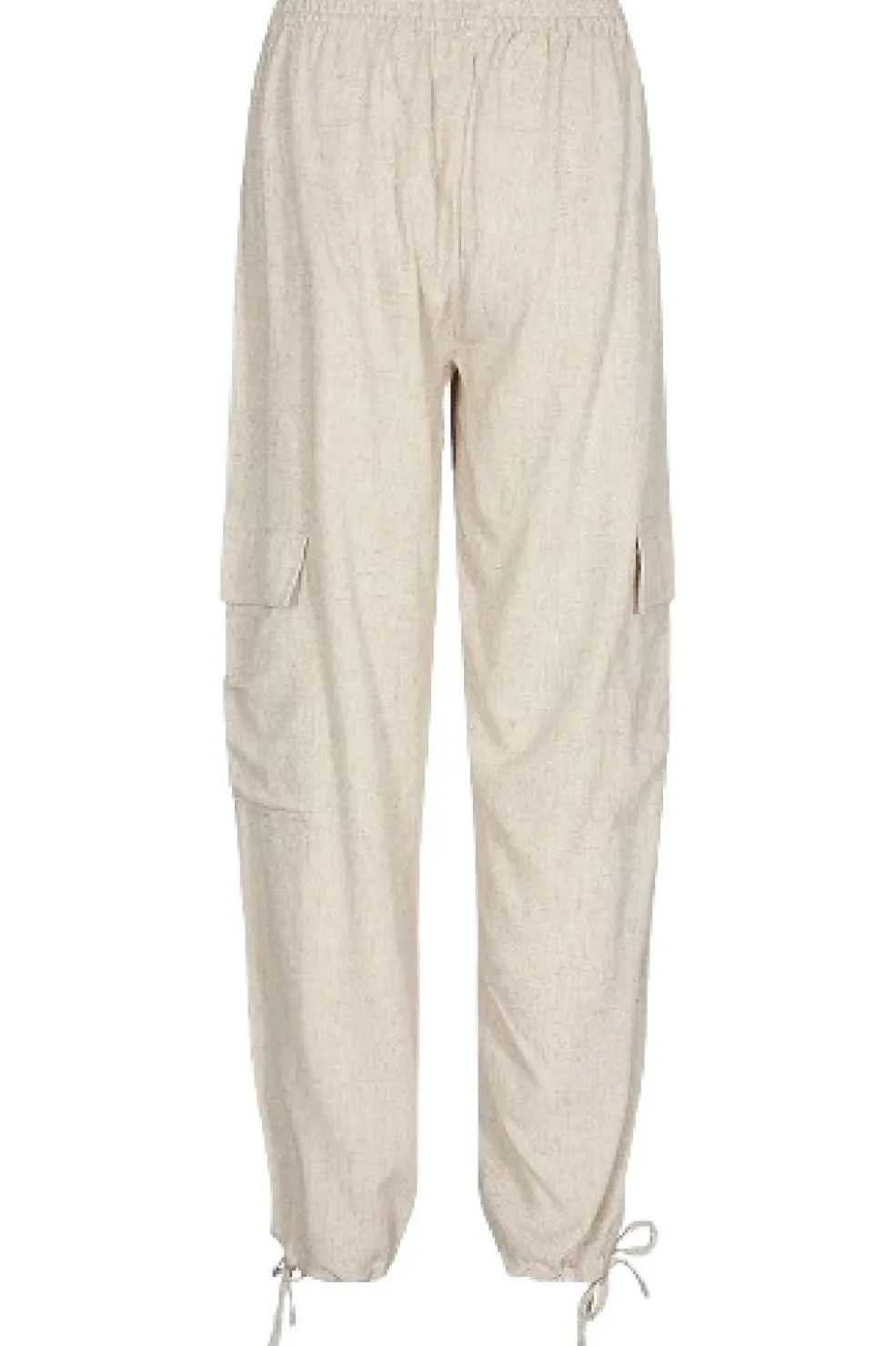Cargo-bukser fra Moves i sandfarvet viskose og linned. Bukserne har en løs pasform med elastisk talje og snøre, praktiske cargo-lommer og snøredetaljer ved anklerne.