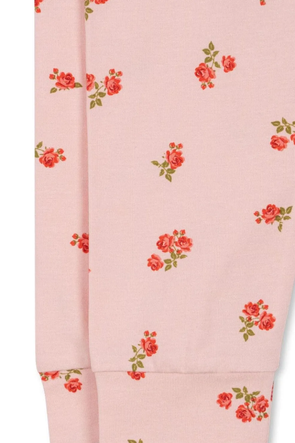 Lyserøde bukser fra Konges Sløjd med røde blomster. Bukserne har en elastisk talje og manchetter ved anklerne.