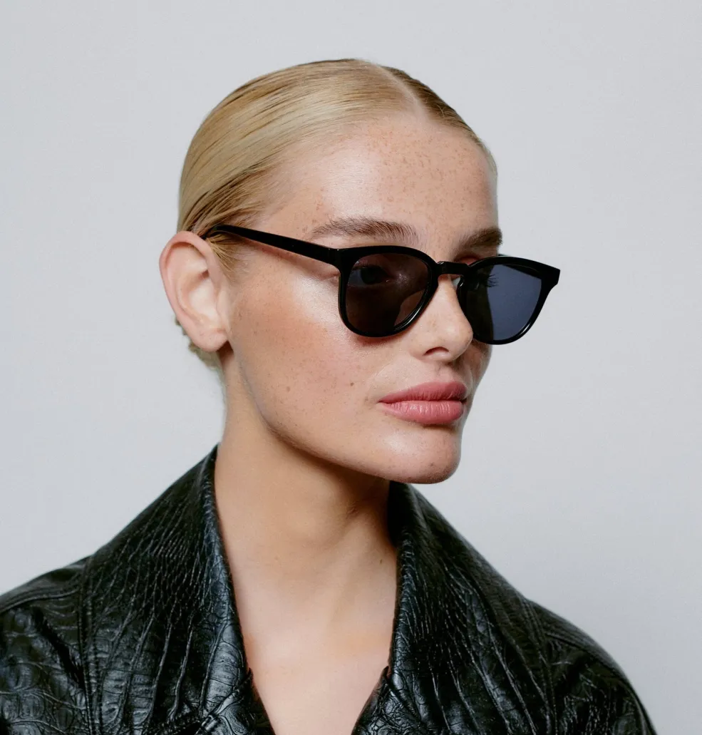 Sorte solbriller fra A. Kjærbede i Wayfarer-form. Stellet er lavet af Tritan Renew med polycarbonatlinser og UV400-beskyttelse. Brillerne har formbare stænger med metalkerner.
