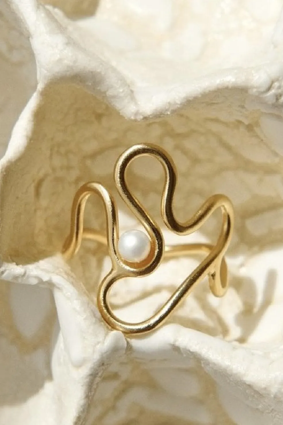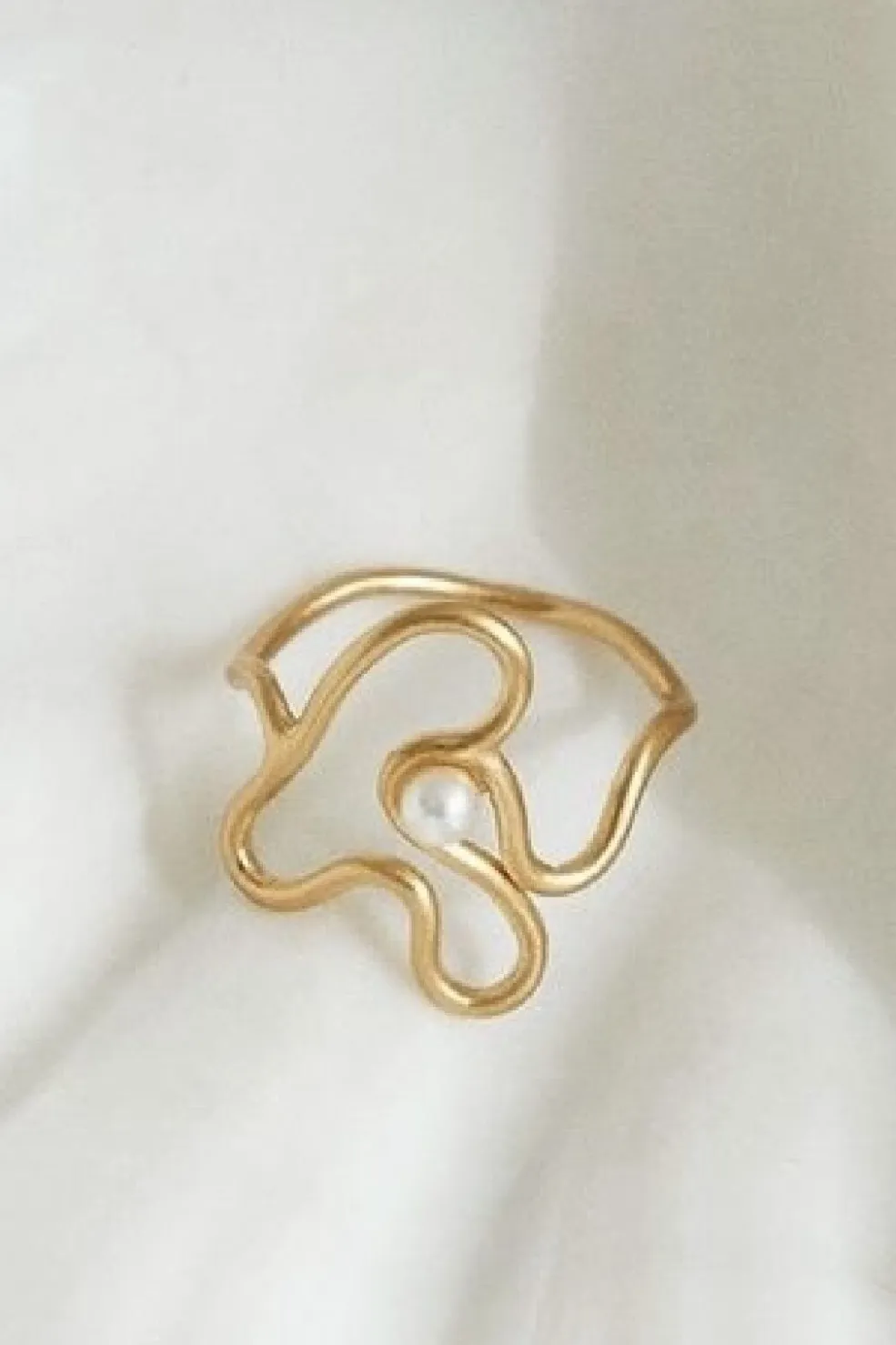 Guldbelagt ring fra Pernille Corydon med et bølget design og en hvid perle. Ringen har en organisk form, der snor sig omkring fingeren med perlen som midtpunkt.