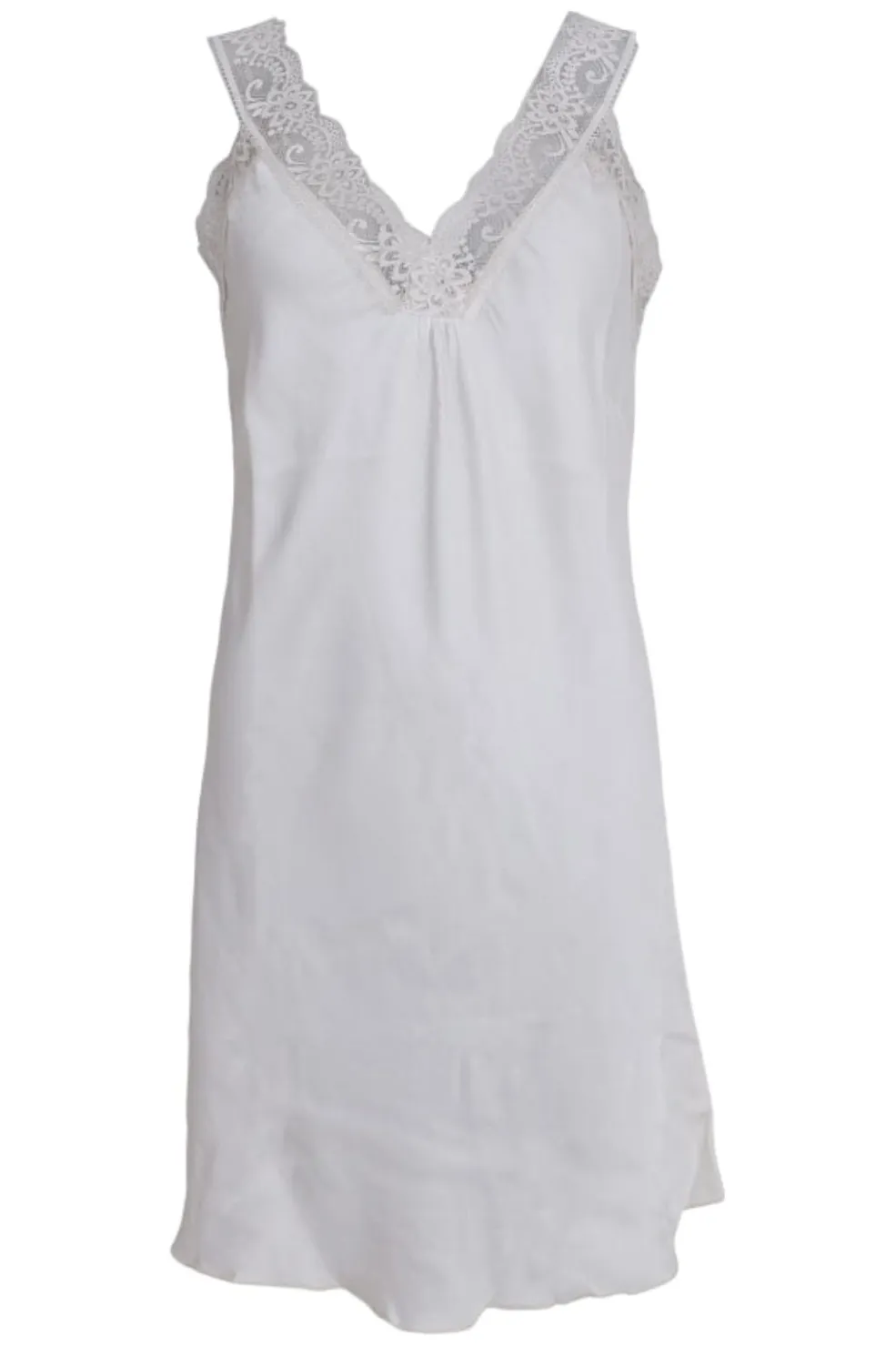 Slipkjole fra Black Colour i hvid med blondedetaljer. Kjolen har tynde stropper og en V-udskæring med blondekant, der går ned til knæene.