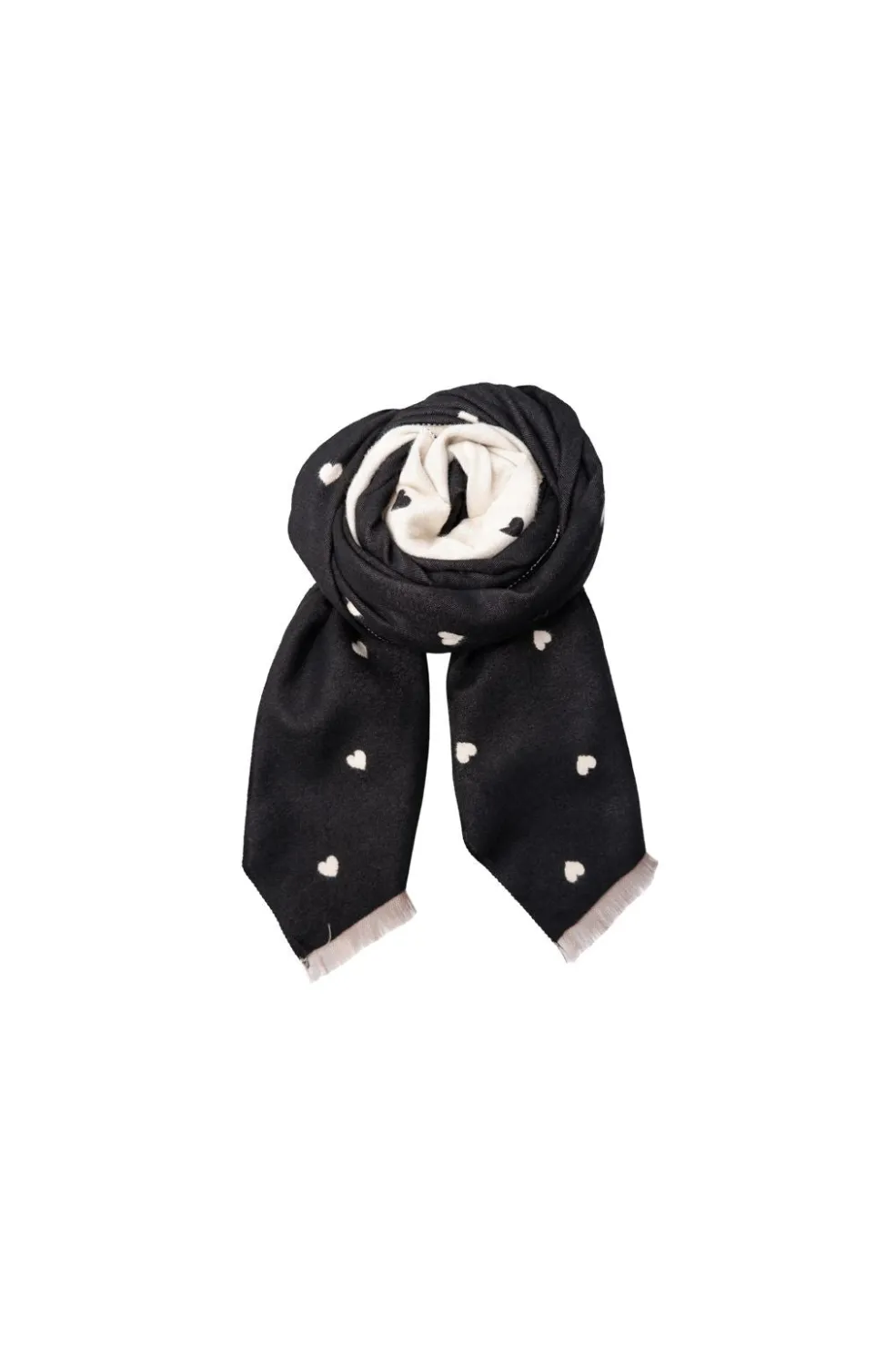 Vintertørklæde fra Black Colour i sort og beige med et hjertemønster. Tørklædet har frynser i enderne og er lavet af akryl.