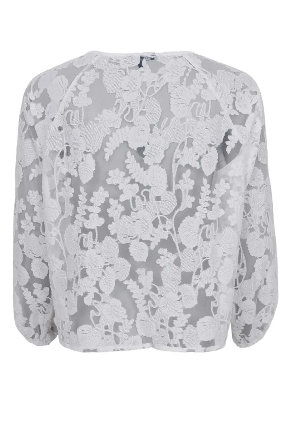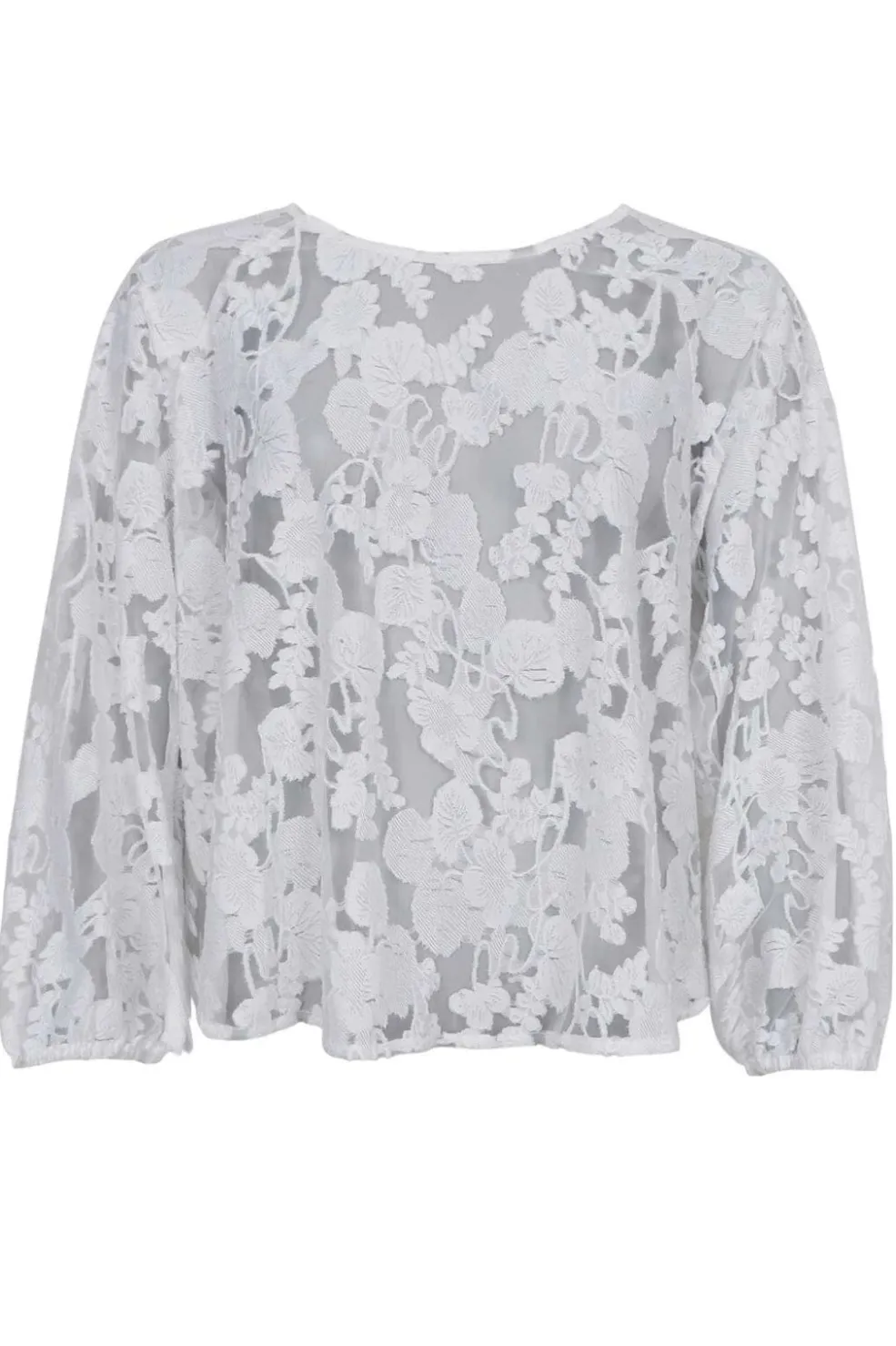 Hvid blondebluse fra Black Colour med blomstermønster. Blusen har en rund halsudskæring og lange ærmer med let puf ved håndleddene.