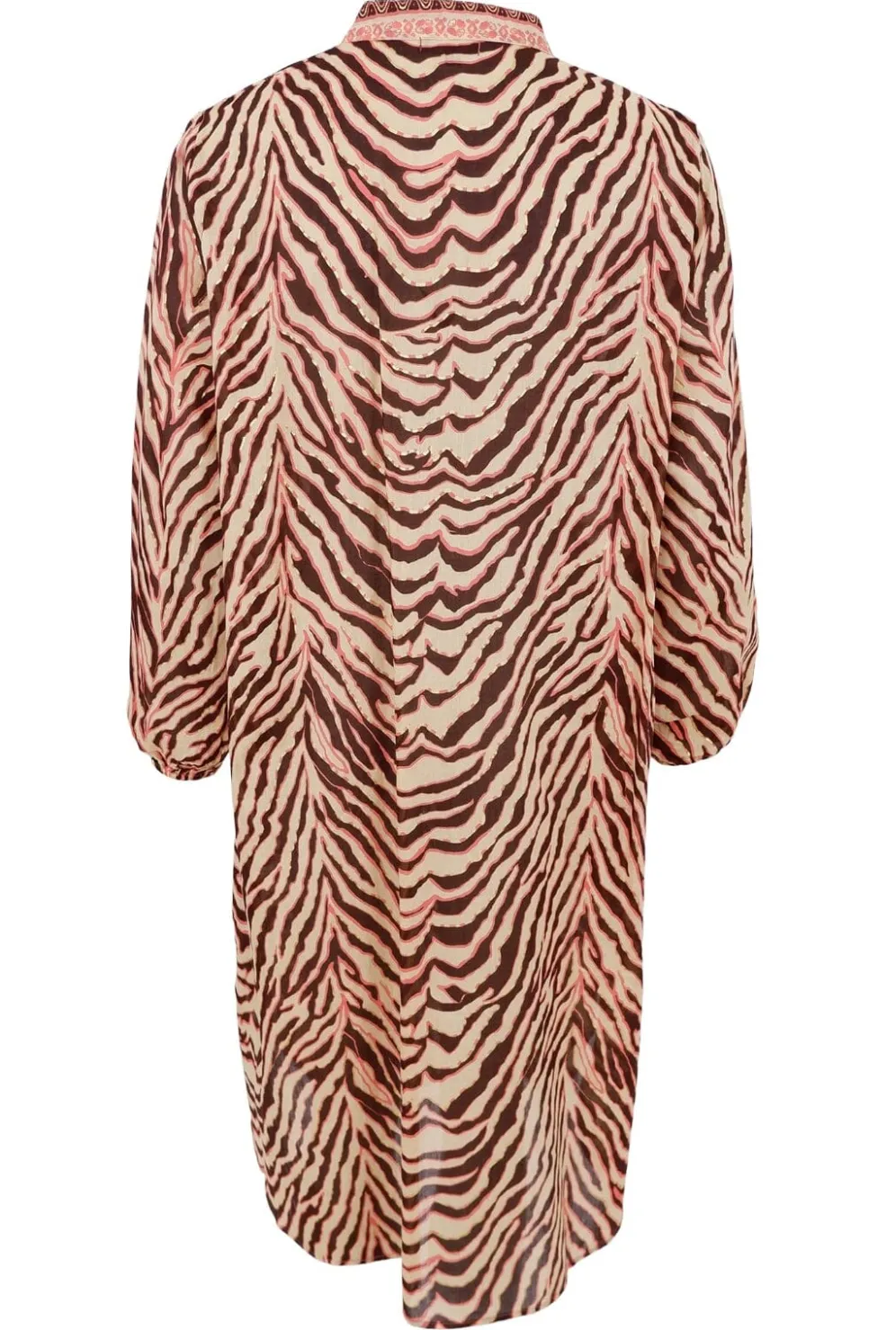 Tunikakjole fra Black Colour med tigerstribemønster i pink og brune nuancer. Kjolen har 3/4 ærmer, polokrave og praktiske lommer i siderne.