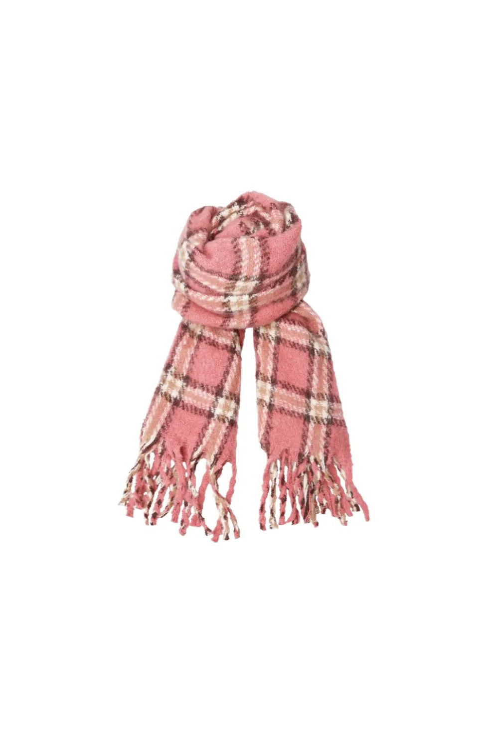 Ternet vintertørklæde fra Black Colour i en rosa nuance. Tørklædet har frynser i enderne og et klassisk ternet mønster med hvide striber på den rosa baggrund.