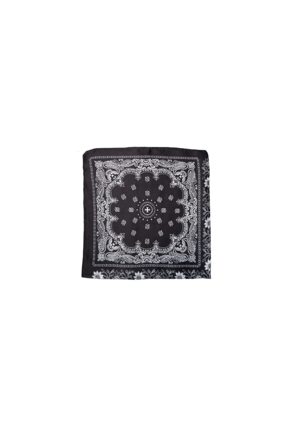 Sort mini-tørklæde fra Black Colour med hvidt paisley-mønster. Tørklædet har et traditionelt kvadratisk design og kan bindes på forskellige måder.