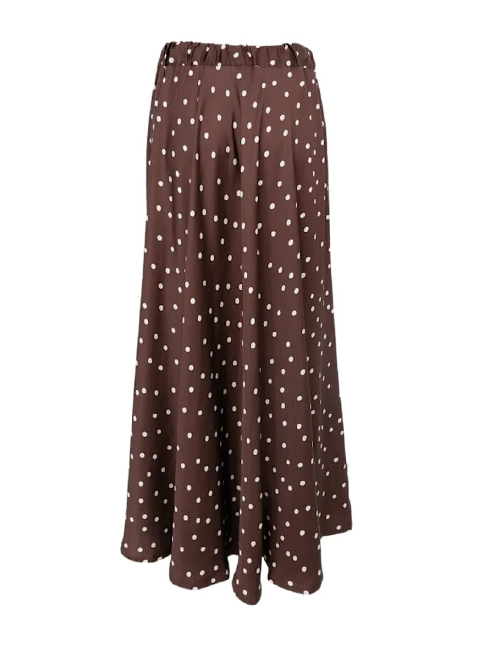 Brun nederdel fra Black Colour med hvide polkaprikker. Nederdelen har en elastisk talje med rynker og et flydende A-formet design.