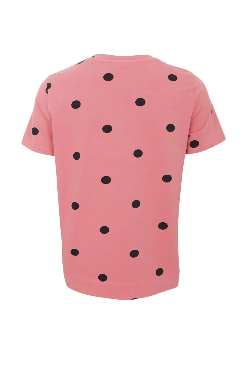 Lyserød t-shirt fra Black Colour med sorte prikker. T-shirten har en rund halsudskæring og korte ærmer med dekorative syninger langs kanterne.