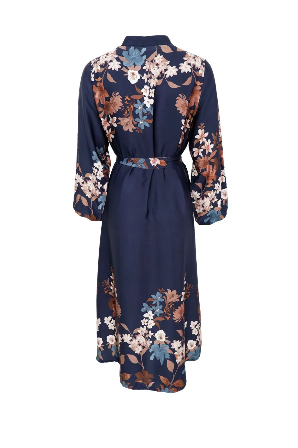 Satinkjole fra Black Colour i mørkeblå med brune og hvide blomstermønstre. Kjolen har knapper hele vejen ned foran og et bindebånd i taljen til at justere pasformen.