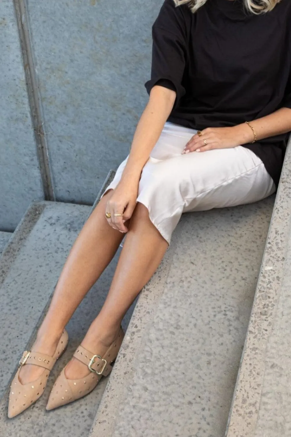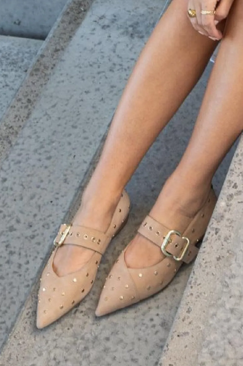 Beige ballerina i ruskind fra Copenhagen Shoes. Skoene har en spids tå med dekorative nitter og en rem over vristen med spænde i metallic finish.