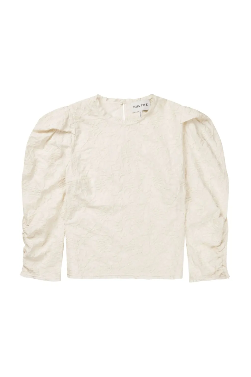 Cremefarvet top fra Munthe, lavet af 82% Viscose Lenzing Ecovero og 18% polyamid. Toppen har et blomstret jacquardmønster med diskret struktur.