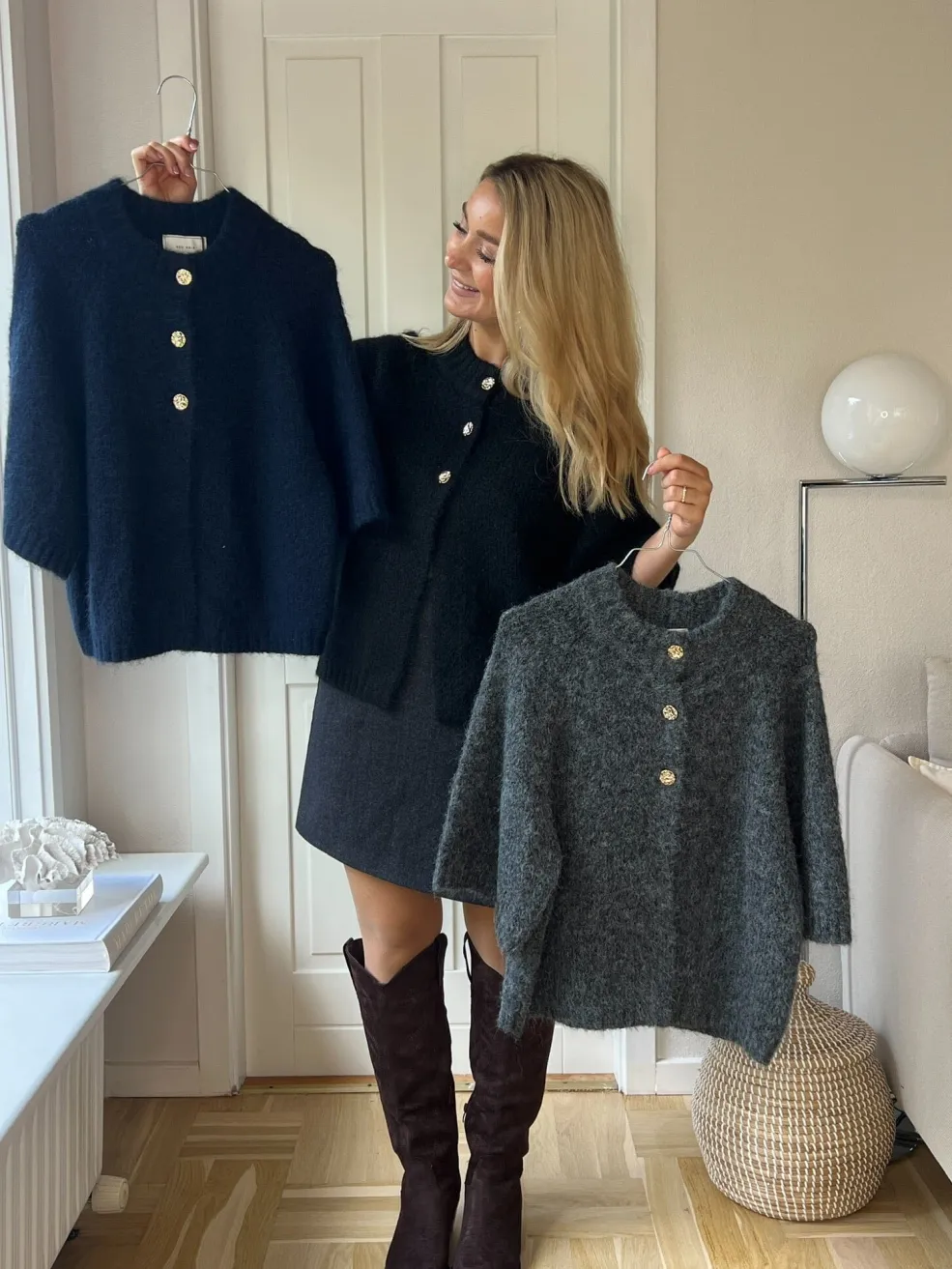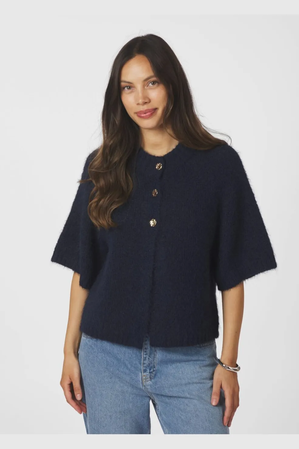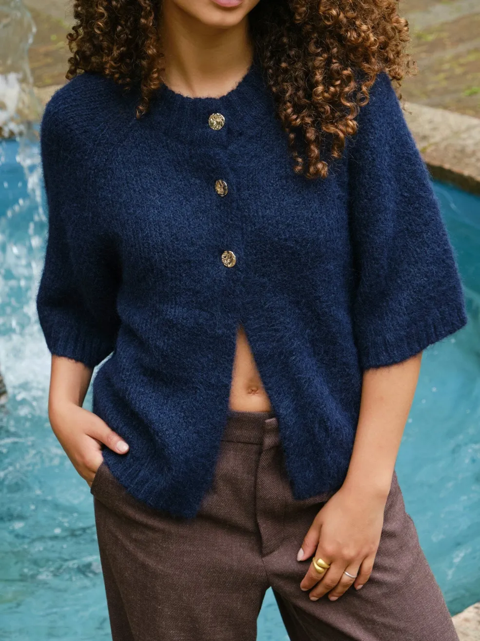 Mørkeblå cardigan fra Neo Noir i en blød, fluffy strikket kvalitet. Den har korte ærmer og en løs, boxy pasform med tre dekorative knapper foran.