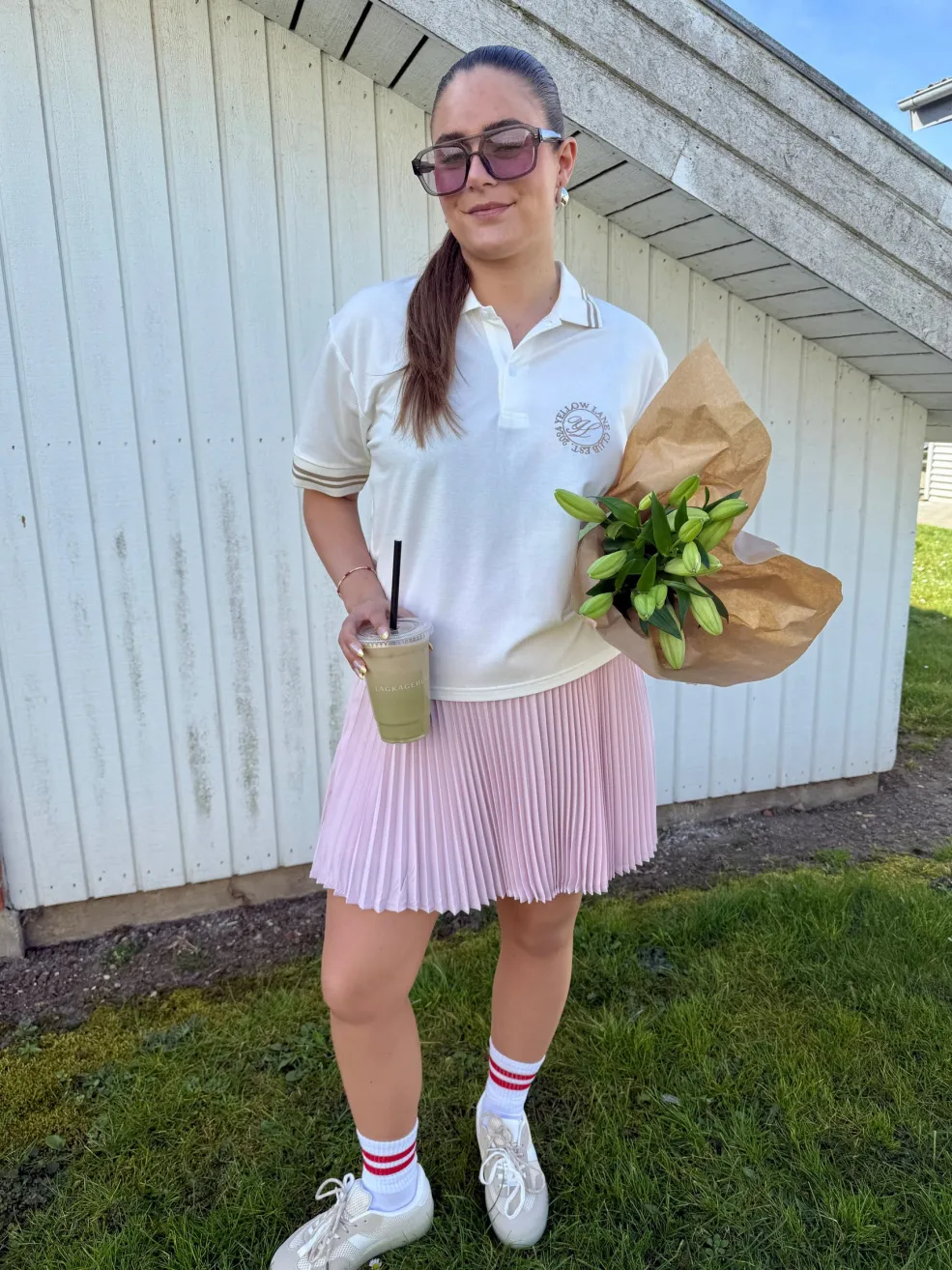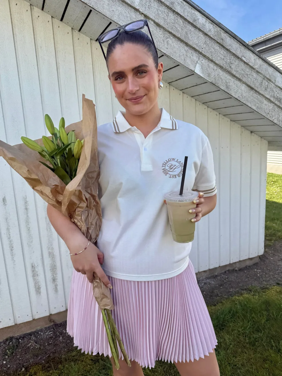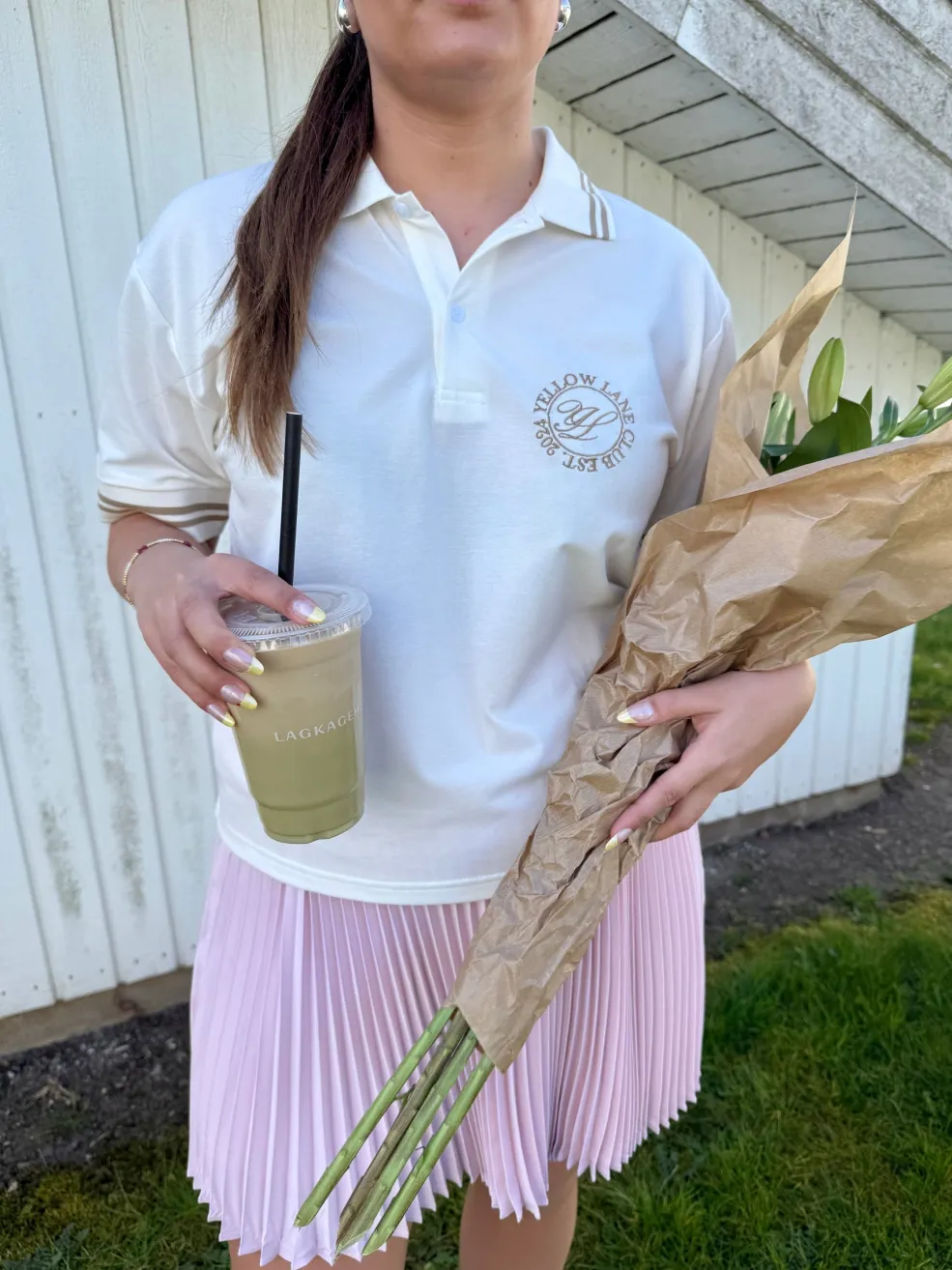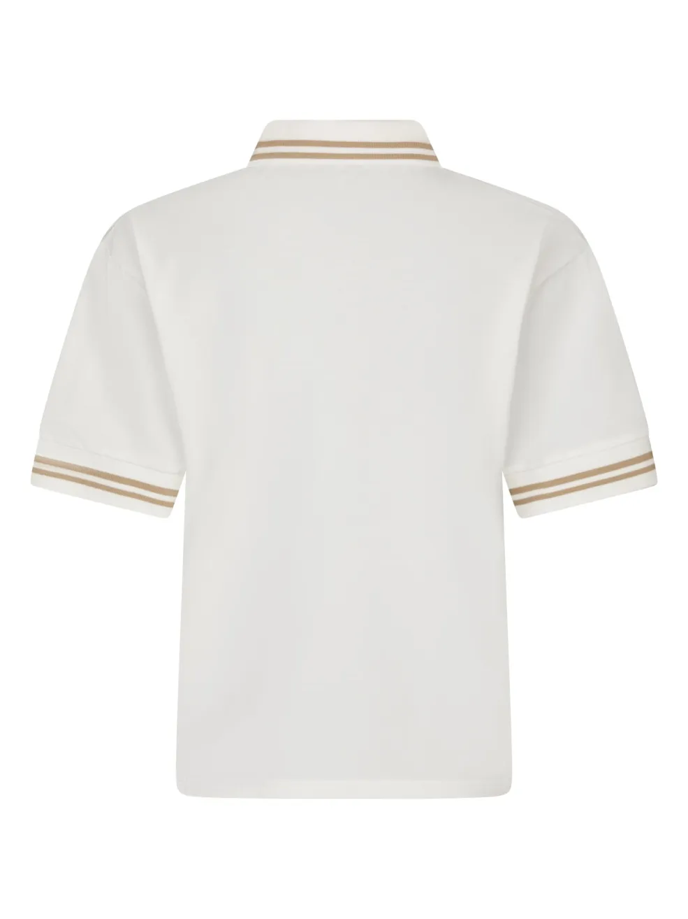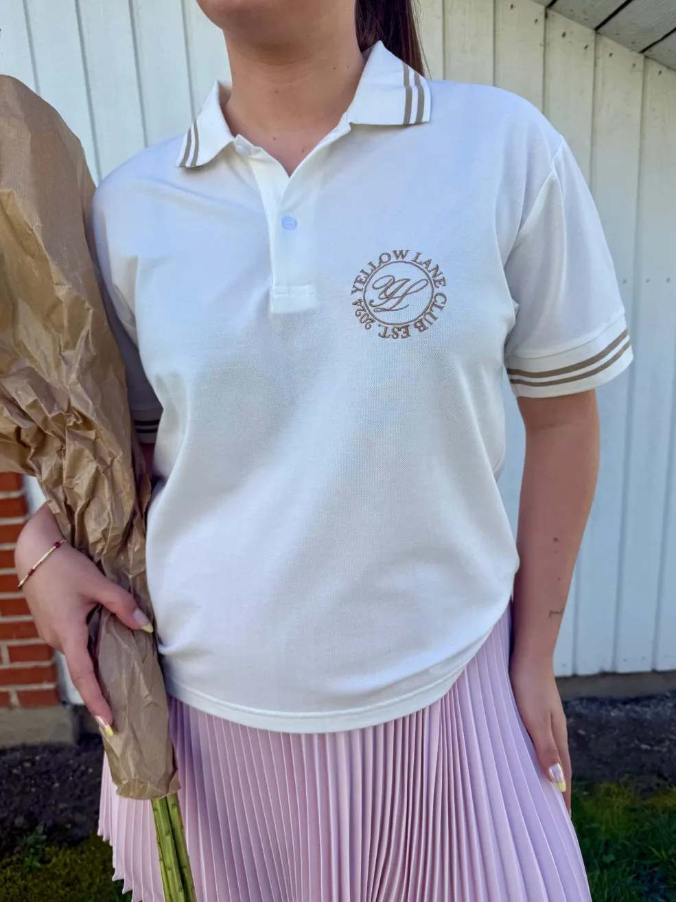 Off-white polo fra Yellow Lane med brune striber på kraven og ærmerne. Et broderet logo pryder venstre side af brystet med teksten YELLOW LANE og EST. 1994.