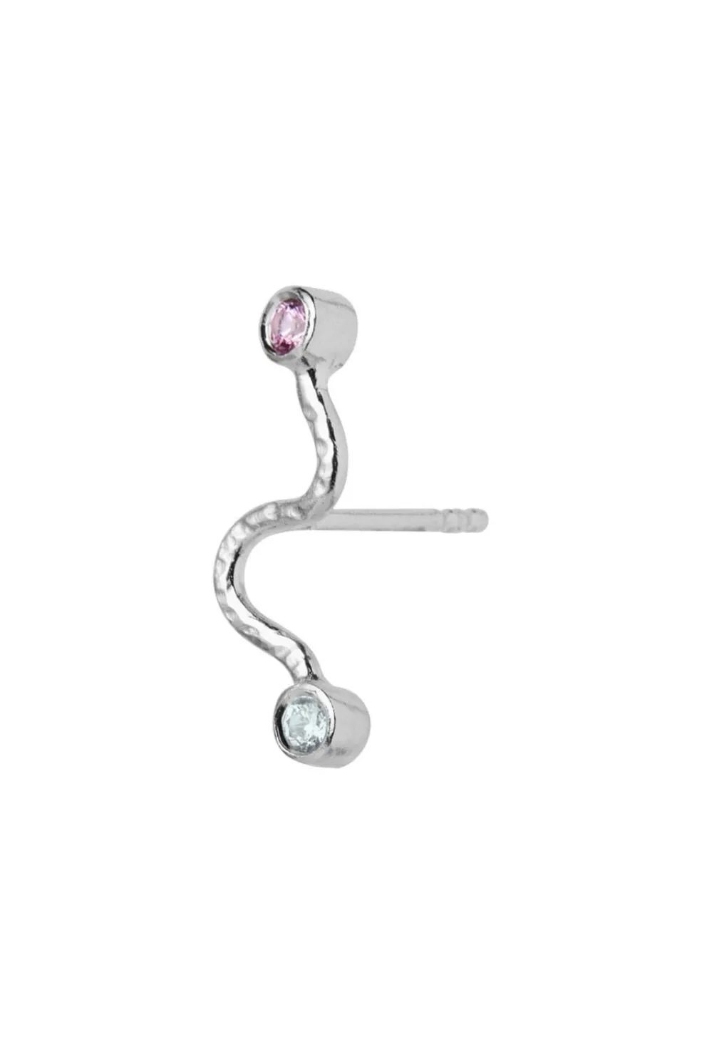 Ørering fra Stine A med en bølget form i hvidt rhodineret sterling sølv. Den har to sten i pastelfarver – en pink og en lyseblå – placeret i hver ende af bølgen.