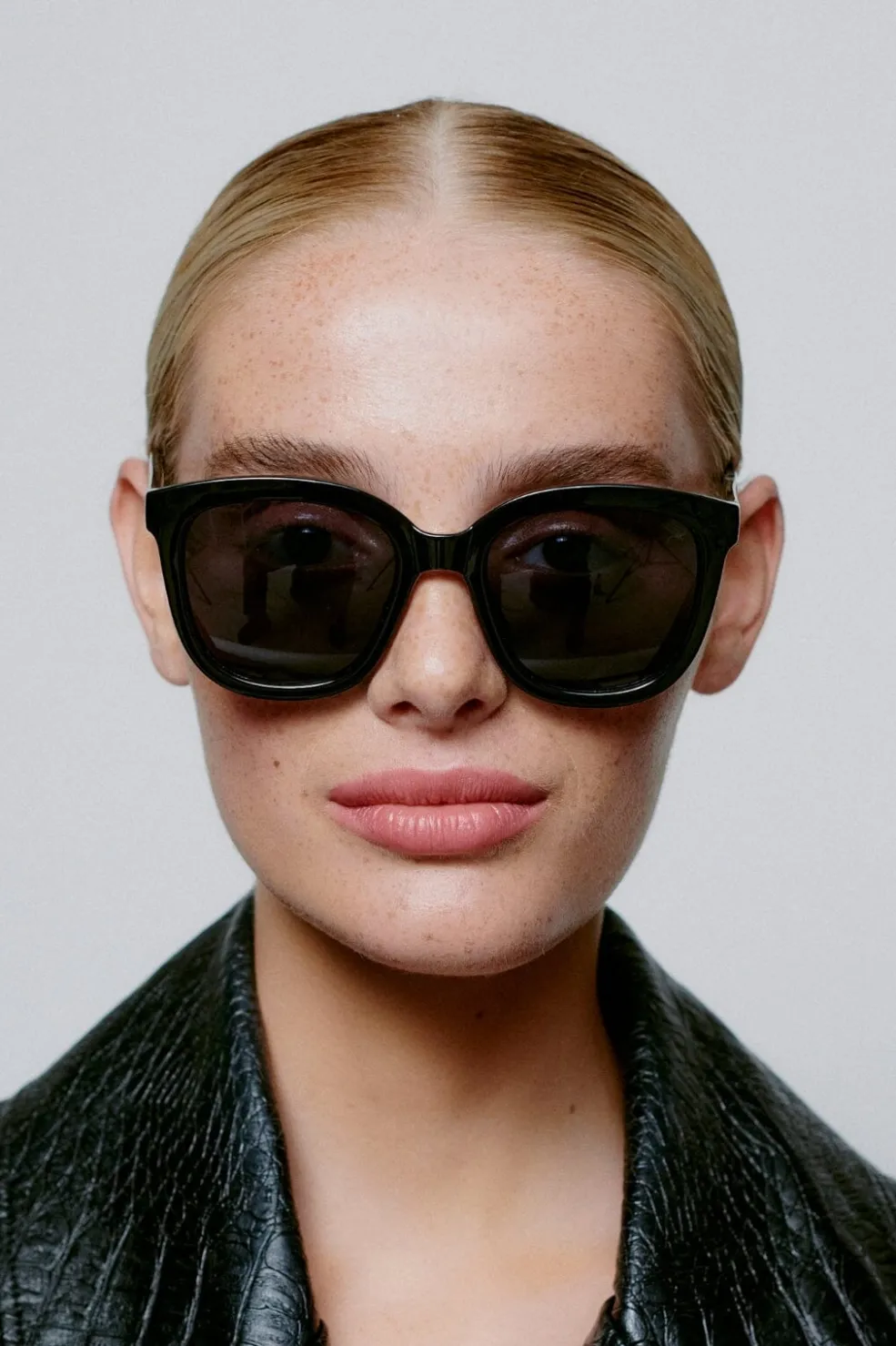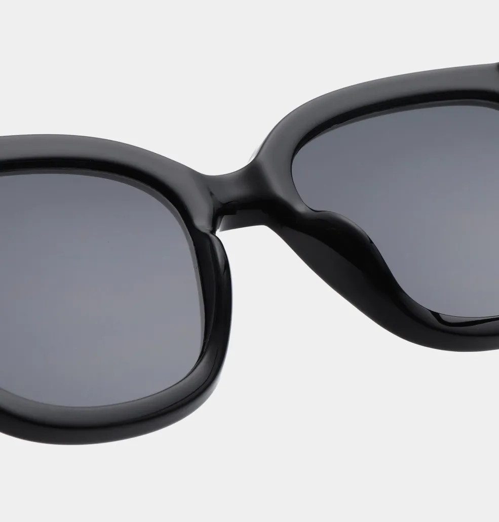 Sorte solbriller fra A. Kjærbede med store firkantede linser og mat ramme. Brillerne har UV 400-beskyttelse og formbare stænger med metalkerner for god pasform.