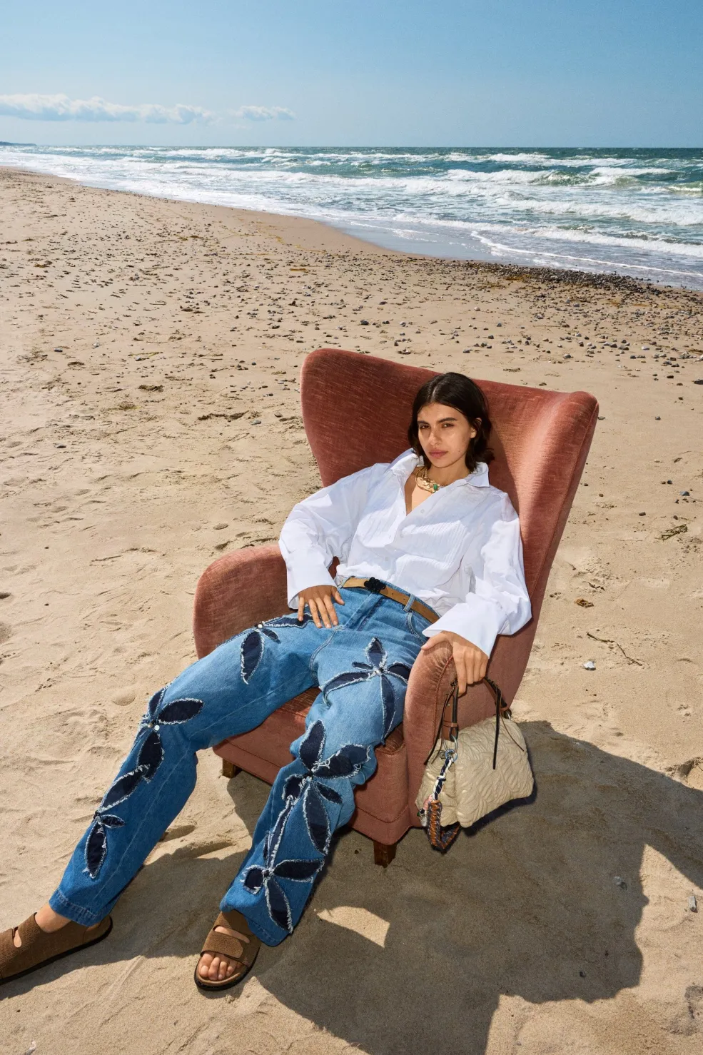 Jeans fra Munthe i blå denim med store, applikerede blomstermotiver på benene. Lavet af 100 % økologisk bomuld med kontrastdenim og dekorative syninger.
