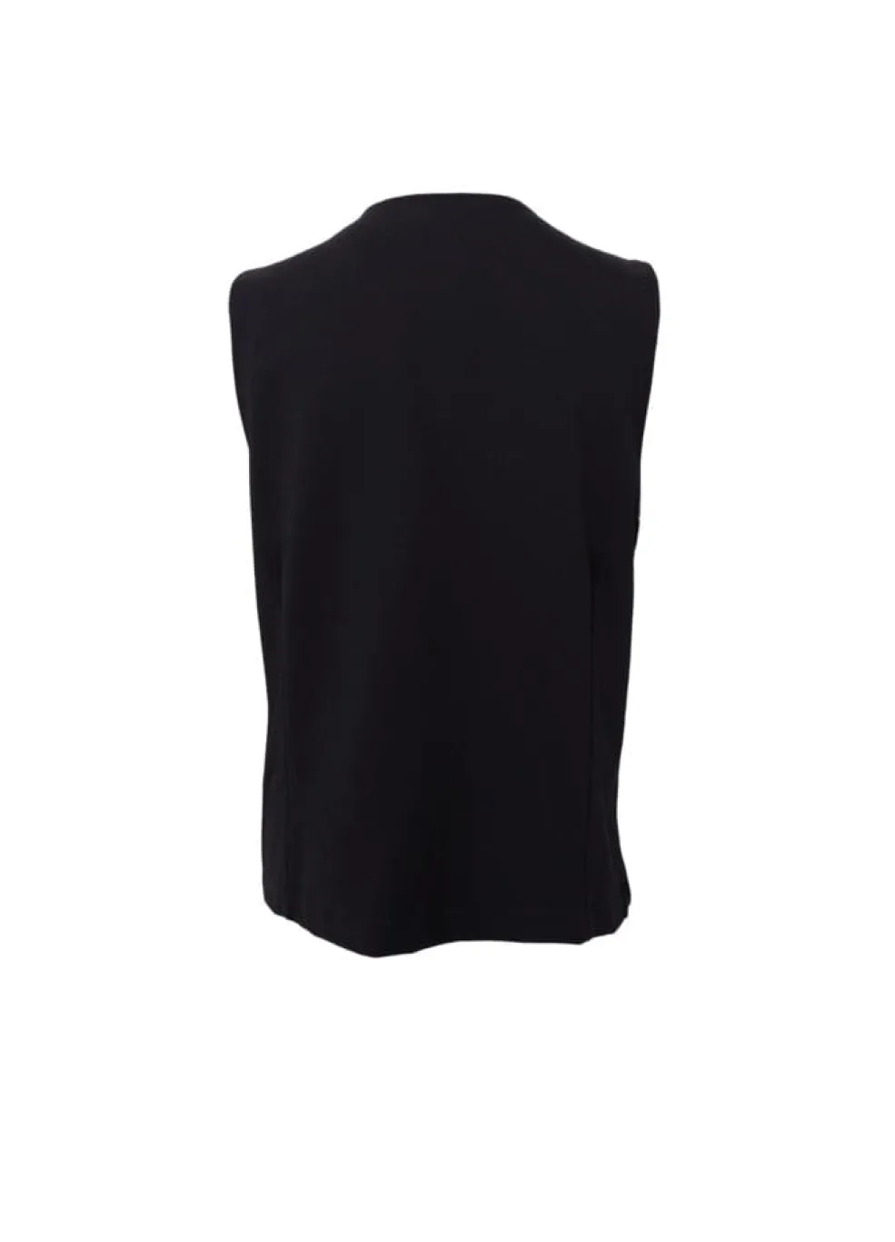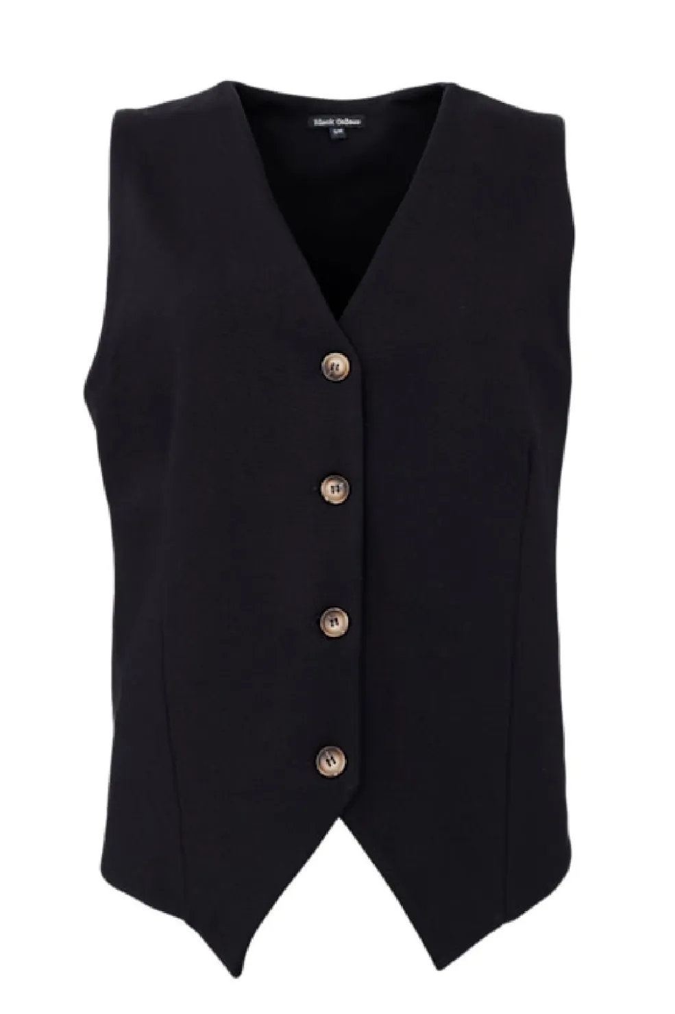 Sort vest fra Black Colour med V-hals og fem kontrastfarvede knapper. Vesten har en hoftelang pasform og er lavet af en blanding af polyester, viskose og elastan.