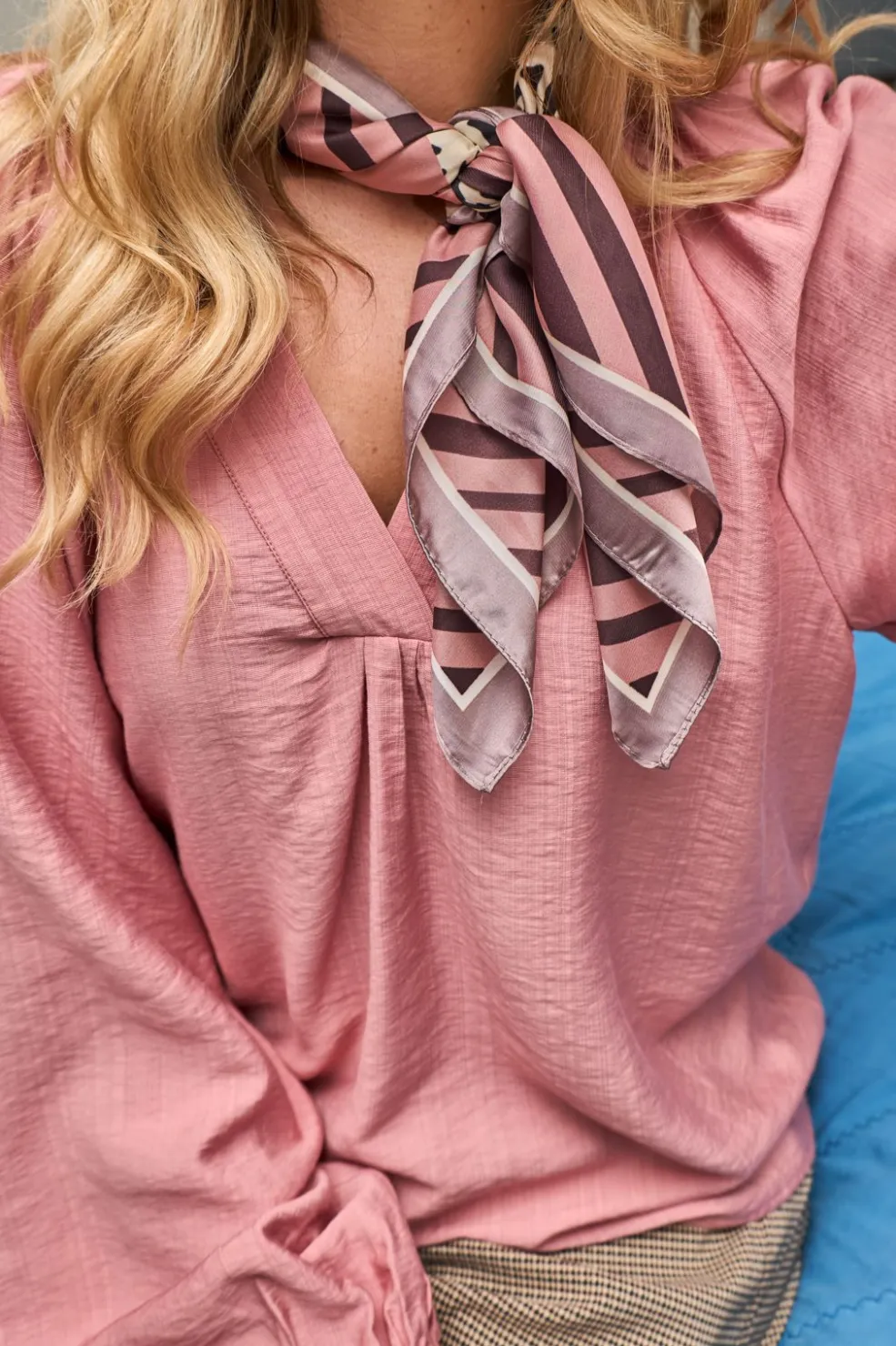 Mini tørklæde fra Black Colour i pink nuance med geometrisk og dyreprintmønster. Tørklædet kan bindes rundt om halsen som et halsbånd.