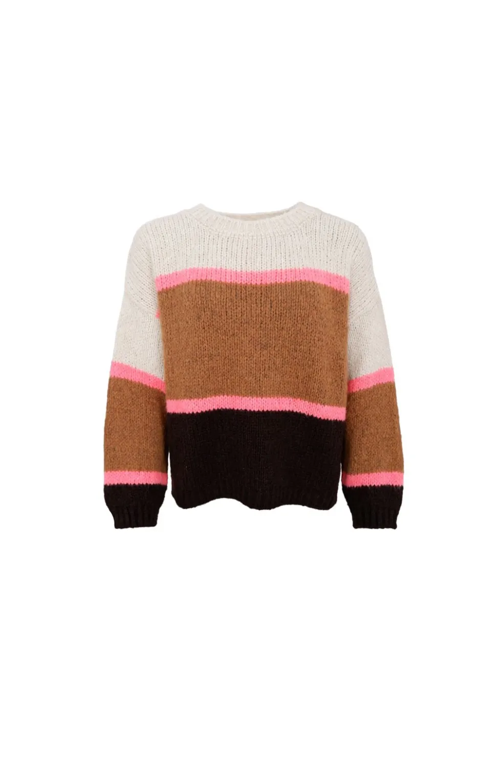 Striktrøje fra Black Colour med farveblokdesign i horisontale striber. Farverne camel, creme, pink, mørkebrun og sort danner kontrasterende bånd gennem trøjen.