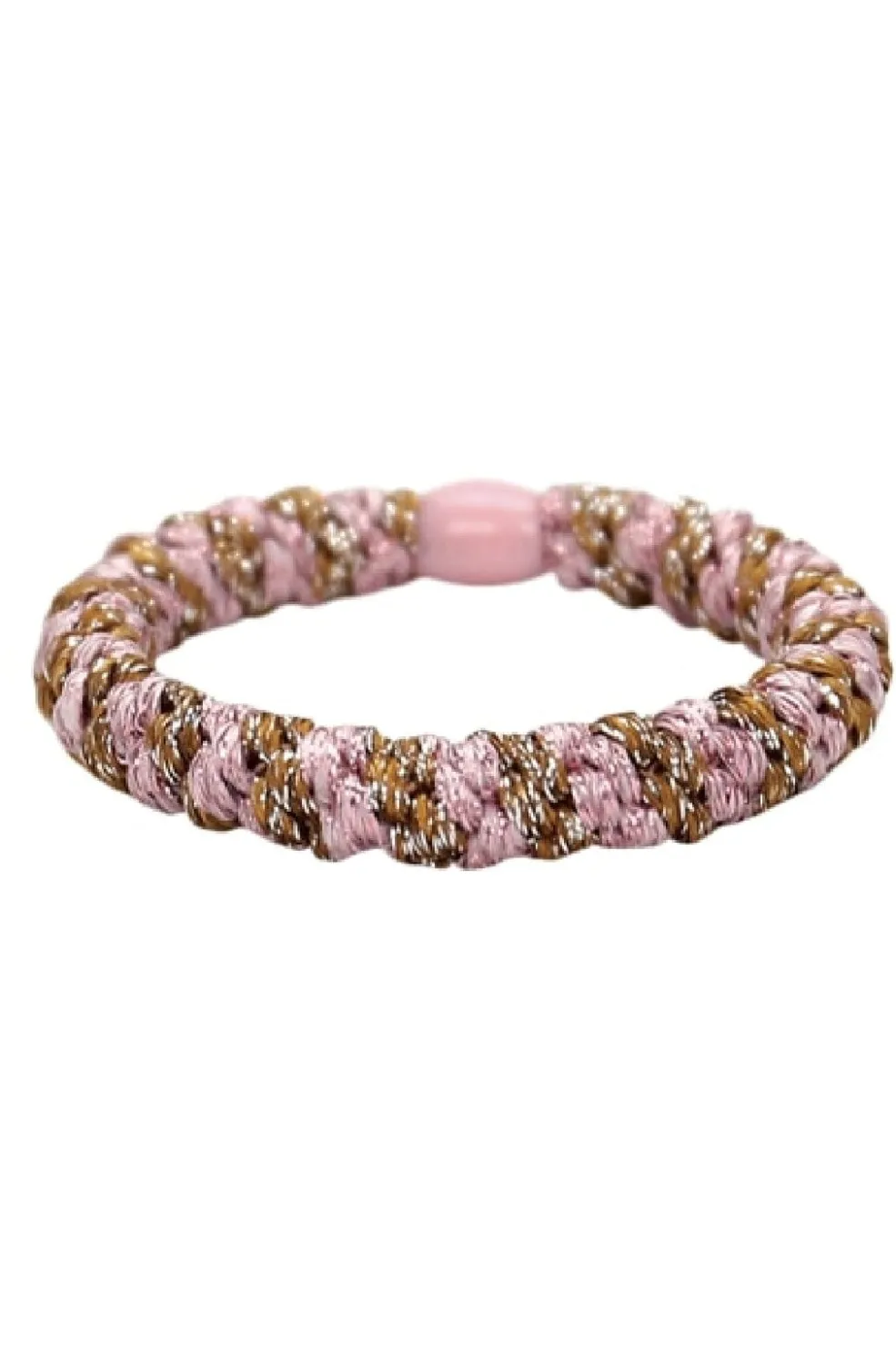Hårelastik fra Black Colour i pink og guld. Den snoede struktur kombinerer de to farver i et dekorativt mønster med en blød glans.