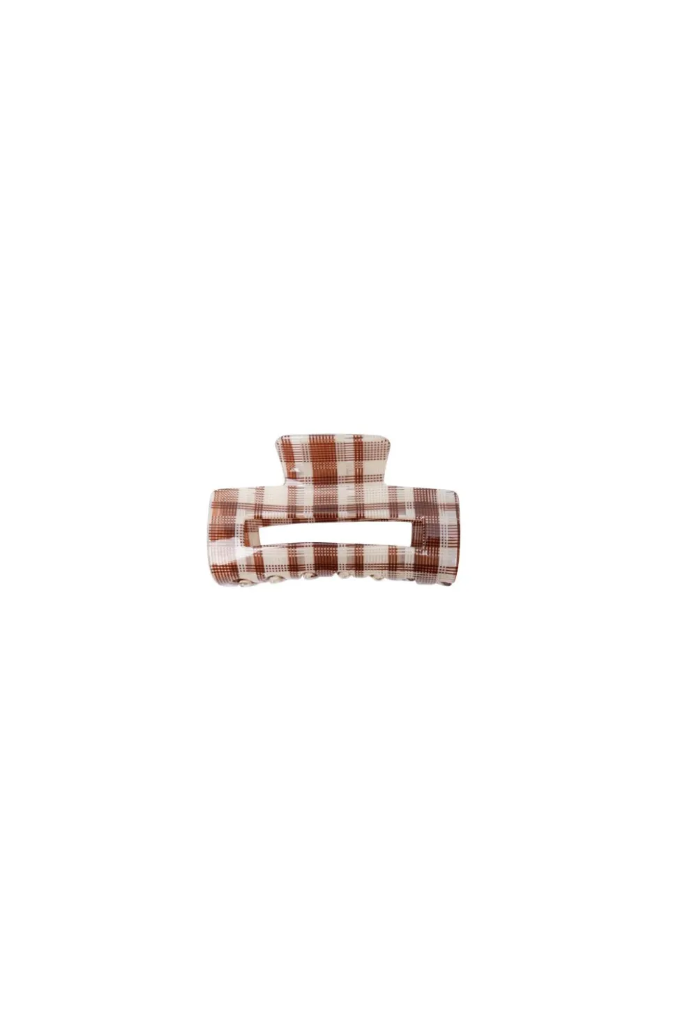 En hårklemme fra Black Colour med et ternet mønster i brune og cremefarver. Hårklemmen har en kompakt størrelse og synlige tænder.