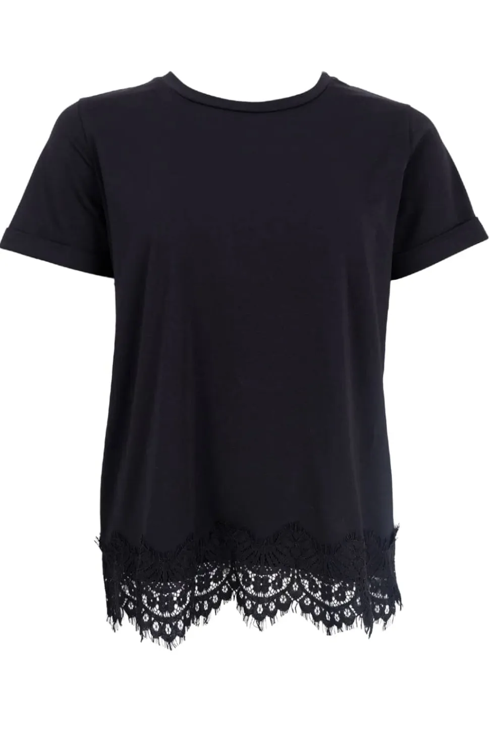 Sort t-shirt fra Black Colour med blonder-detalje i bunden. Den har en rund halsudskæring og korte ærmer. Blonden giver t-shirten et feminint præg.
