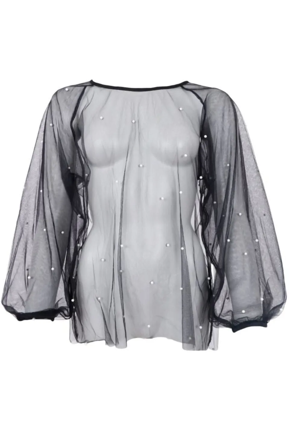Sort gennemsigtig bluse fra Black Colour med polka dot-mønster. Blusen har perlelignende dekorationer og en løs pasform med lange ærmer og rund hals.